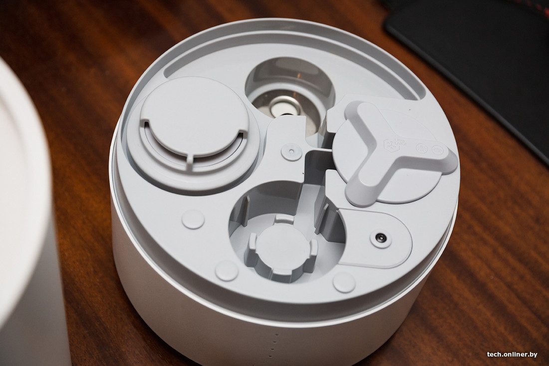 Собственно, аппарат вмещает в себя около 3,5 литра воды, которая проходит очистку УФ. По размерам он походит на кухонный комбайн, да и внутри выглядит примерно так же. Внешне это простой цилиндр с отверстием для пара и крышкой, под которой находится емкость для воды. На практике Air Humidifier в стандартной жилой комнате площадью 15—20 кв. м увлажнит воздух примерно на 10% за час — зависит от температуры окружающей среды и исходных показателей. В сценарии запуск устройства можно привязать к внешнему датчику влажности.