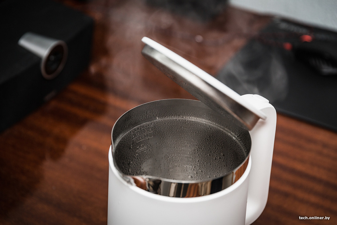 У Mi Smart Kettle имеются привычные системы безопасности в виде блокировки крышки и блокировки включения без воды. Небольшие претензии возникли к сборке: крышка немного люфтит в стороны, однако это стало заметно лишь при внимательном изучении чайника. Вскипает устройство очень быстро, на экране смартфона в режиме реального времени выводится текущая температура воды и меняется цвет фона — от синего к красному. В приложении можно задать температуру, которую чайник после закипания воды должен поддерживать на протяжении заданного же времени. Девайс интересен «поиграться», однако спустя максимум неделю вы почти наверняка будете использовать его как обыкновенный электрочайник — подошел, включил, забыл.
