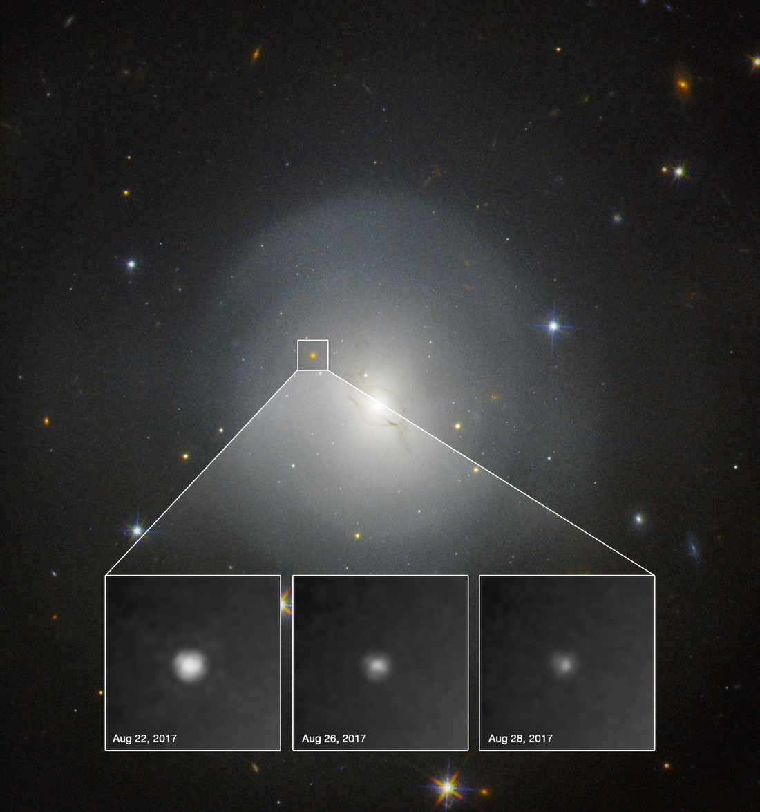 Октябрь не обошел стороной и открытия, связанные с дальним космосом, но по причине ограниченности количества символов в статье мы расскажем только о самом важном. На небе сейчас только и разговоров, что о море и гравитационных волнах! 16 октября обсерватория LIGO впервые отчиталась о наблюдении волн, порожденных в ходе процесса слияния двух нейтронных звезд. Само по себе событие произошло еще 17 августа и прекрасно тем, что в результате коллаборации и слаженной работы многих команд по всему земному шару, удалось не просто зафиксировать его гравитационный след, но и локализовать его в пространстве и даже наблюдать в различных диапазонах. В наблюдениях участвовало около 70 обсерваторий, среди которых LIGO, европейско-российско-американский INTEGRAL, европейско-американский Hubble, наземный «флот» телескопов ESO и многие другие — настоящая слаженная международная работа! Источник волн находился в галактике NGC 4993 в созвездии Гидры. Она отдалена от Солнечной системы на 130 млн световых лет.