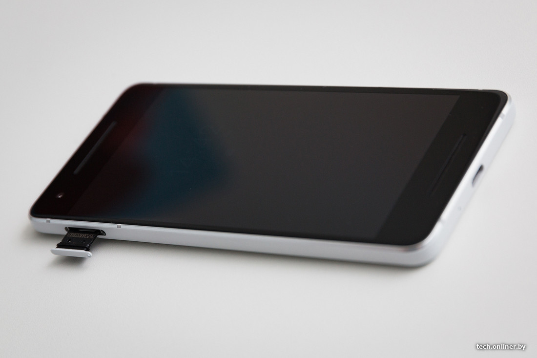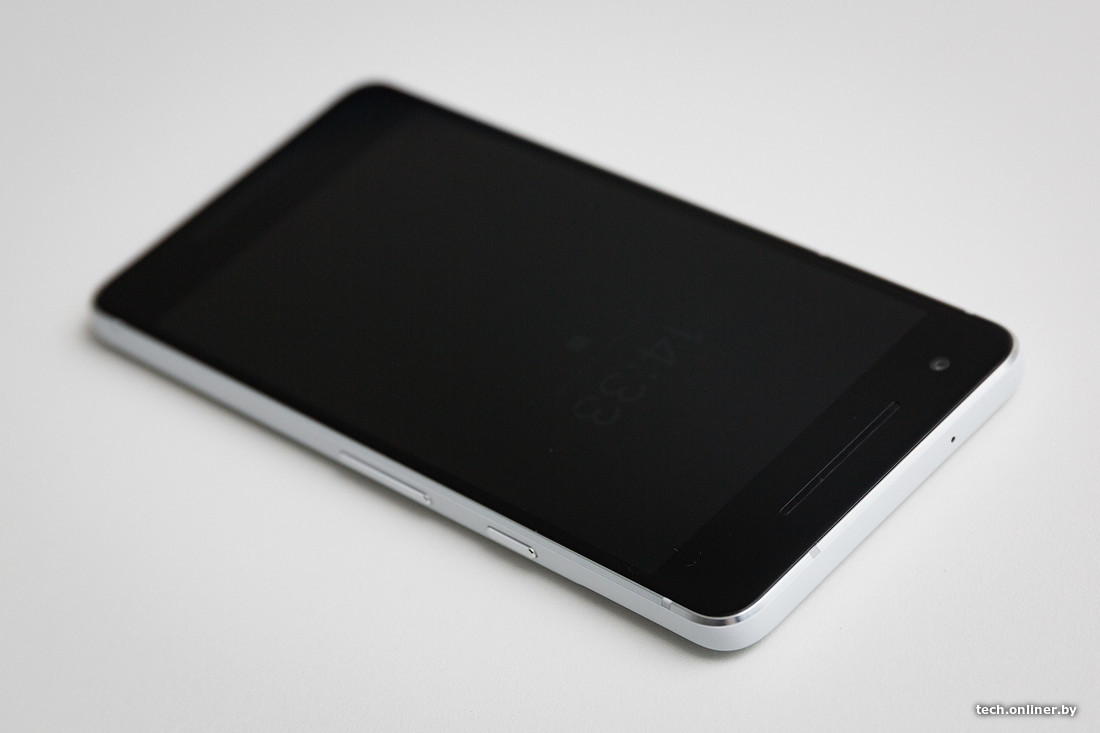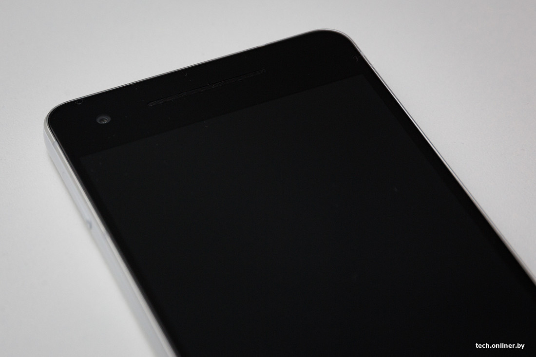 На фронтальной панели черного цвета заметен 8-мегапиксельный фотомодуль, а также две горизонтальные прорези стереодинамиков — над и под экраном. Нижний динамик, выводя низкие частоты, играет роль сабвуфера, верхний же отвечает за средние и высокие. Расслышать эту разницу можно лишь поднеся телефон ближе к уху.
