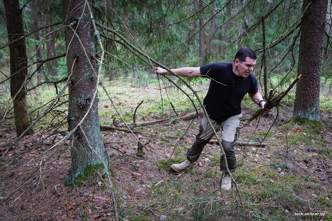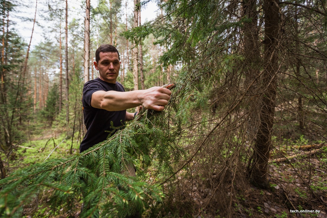 — Энцефалит, болезнь Лайма, геморрагическая лихорадка, — специалист по выживанию Сергей Гращенко из surv.by буднично перечисляет возможные последствия укуса клеща. Отказываться от похода в лес на тот момент было уже поздно: мы проехали около 70 километров до Налибокской пущи. Осталось только затянуть носки повыше на джинсы и особо тщательно облить ноги спреем против всякой живности. Оператор надел кепку и для надежности закутался в капюшон — клещи вроде как с деревьев не падают, но вдруг они поумнели? Нас ждал день в лесу практически в первобытных условиях: никаких мобильников, GPS-трекеров, компасов и зажигалок. Только нож и тяга к выживанию.