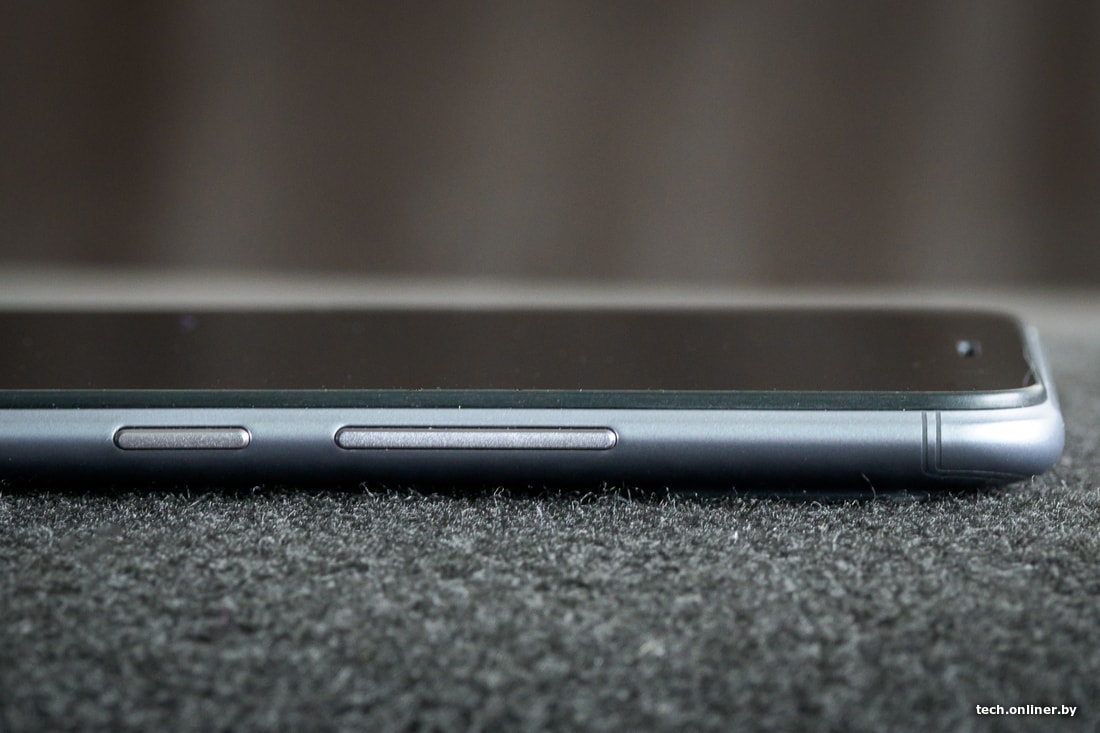 Задняя панель лаконичная, с углублением под сканер отпечатков пальцев и двойной фотокамерой в левом верхнем углу. Она приподнята над корпусом и расположена вертикально. На левой боковине — лоток для двух SIM-карт формата nano и объемной (в гигабайтах, а не по размеру) карты памяти, то есть слотов в общей сложности три. Оба модуля для симок поддерживают сети LTE.