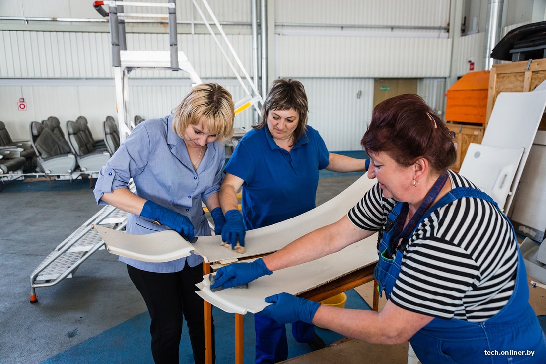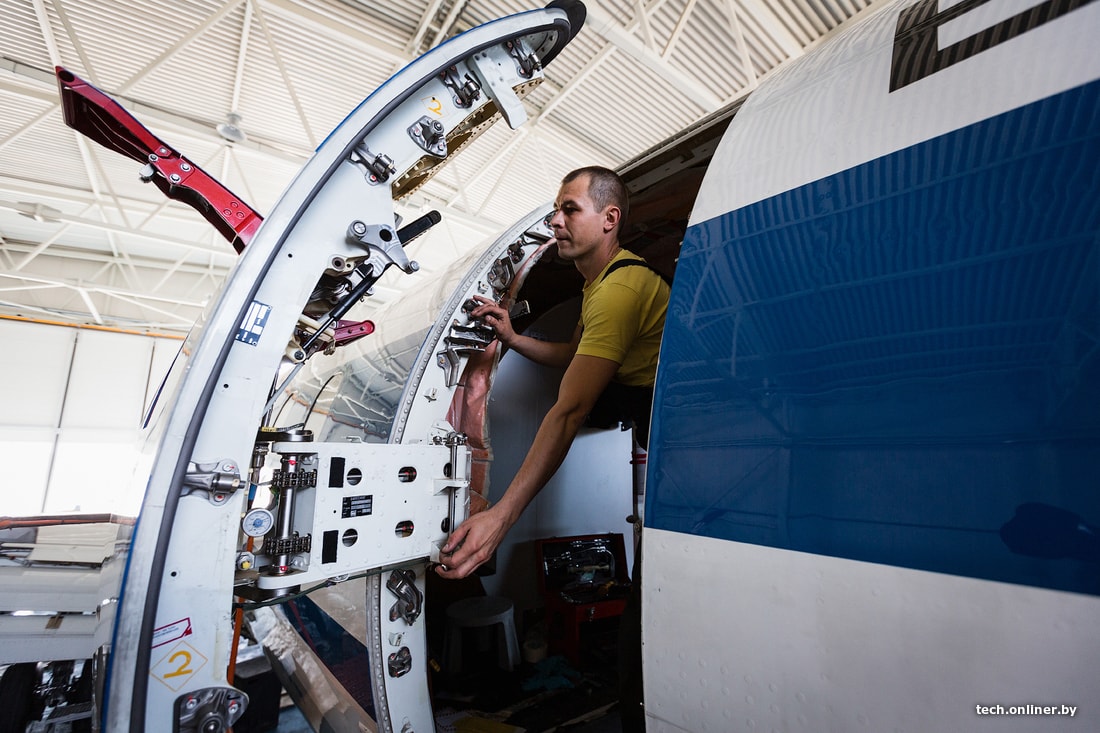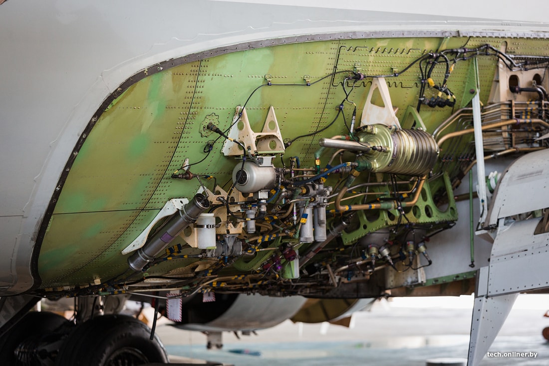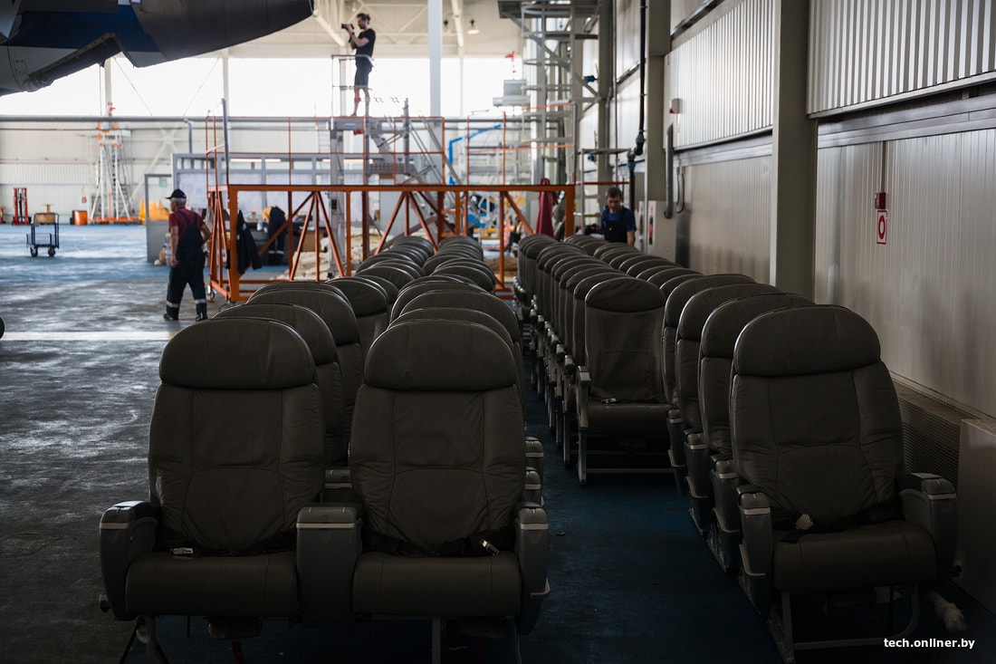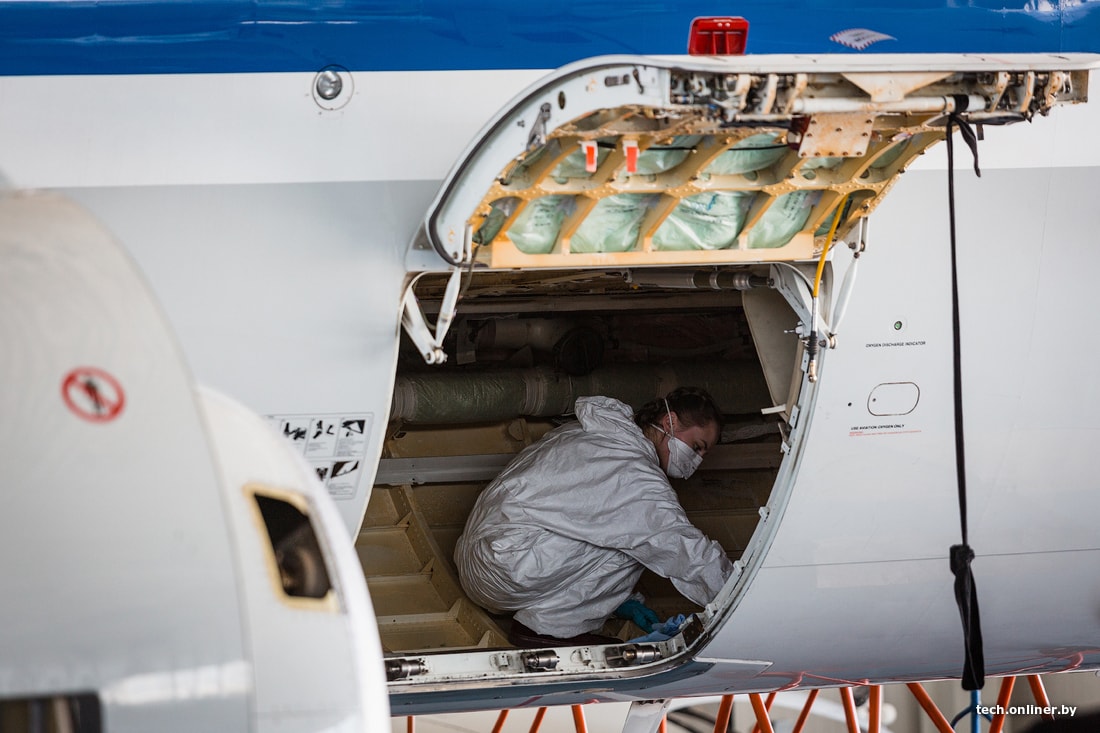Перед нами один из первых новых самолетов, поступивших в авиапарк Belavia напрямую с завода-изготовителя. Авиакомпания с прошлого года начала самостоятельно выполнять обслуживание в объеме C-Check. Иногда все еще отправляют лайнеры за рубеж (в Литву, например), но теперь стараются по возможности проводить ТО своими силами — это выходит намного дешевле. В компании говорят, что есть интерес со стороны других авиаперевозчиков, но пока сторонние самолеты на обслуживание не принимают: с собственным парком бы справиться.