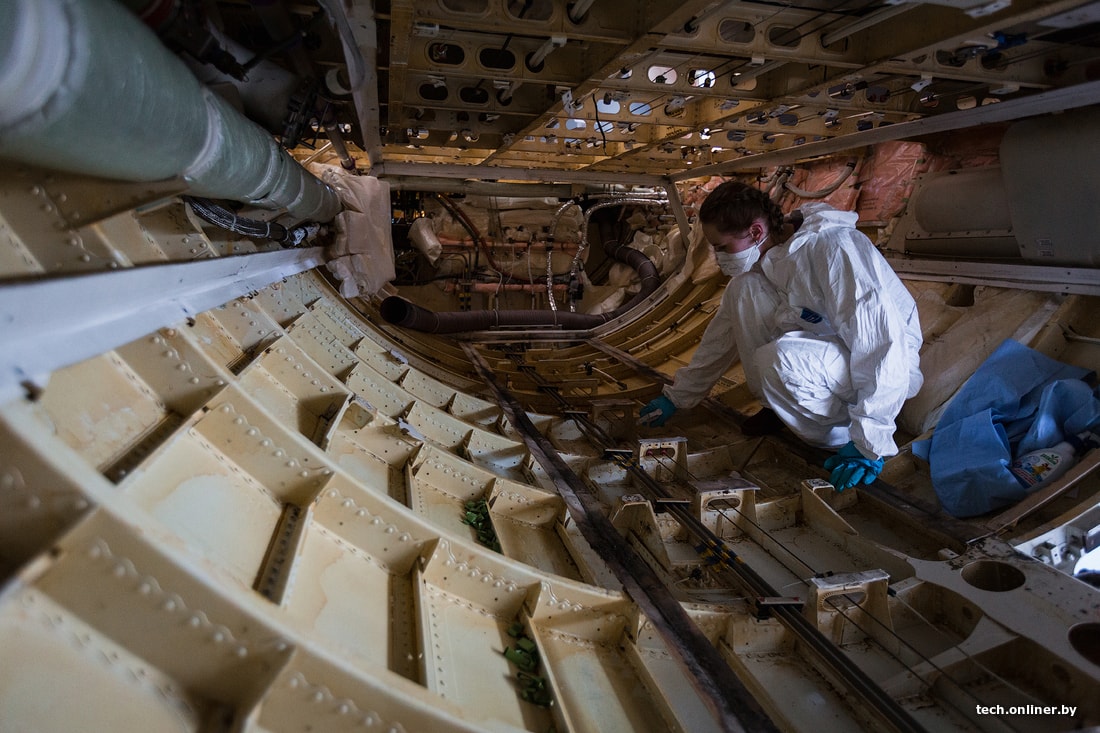 Разобранный Embraer 175 усеян табличками с тревожной надписью «caution label» — там, где они висят, есть какие-то проблемы. Навскидку таких плашек штук двадцать, не меньше. Первая мысль: «Как лайнер летал с таким количеством неполадок?» Представители Belavia успокаивают: табличка крепится вообще при малейших недочетах — вплоть до стершейся краски. Этот Embraer примерно за шесть лет налетал уже 15 тысяч часов — столько не у каждого командира воздушного судна за всю карьеру наберется. Теперь лайнер требуется освежить, чтобы он дальше радовал пассажиров, а число взлетов продолжало равняться количеству приземлений.
