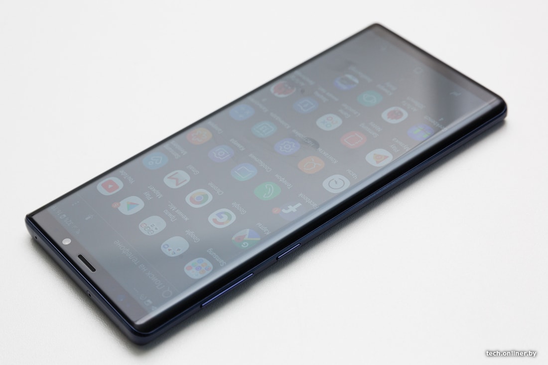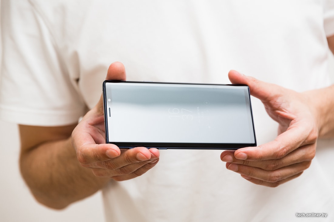 В отличие от Galaxy S9+, модель Note 9 имеет более очерченные грани, вернее, четко очерченные, так как держать в руке мобильник удобно и торцы не впиваются в ладонь.