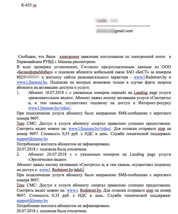 Тем временем Николаю пришел ответ из милиции. Как отметили правоохранители, оператор life:) заверил, что абонент сам зашел на landing page развлекательных ресурсов и нажал на кнопку «Смотреть», тем самым активировав на них подписку.