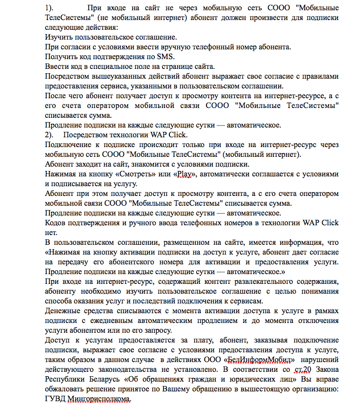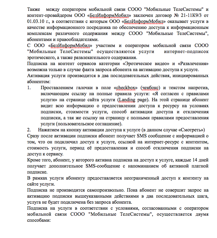 Там также почему-то рассказывается о правилах оказания услуг и условиях договора между оператором МТС и контент-провайдером «БелИнформМобил», хотя изначально речь шла про оператора life:). Впрочем, это не так уж важно, потому что суть позиции компании остается прежней — ошибок быть не может, абоненты сами подключают себе доступ к эротическим видео, несмешным анекдотам и прочему.