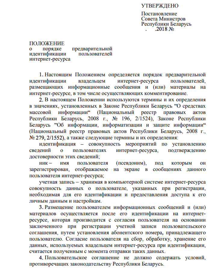 На правовом форуме Беларуси появился проект постановления Совета министров «Об утверждении Положения о порядке предварительной идентификации пользователей интернет-ресурса». В нем говорится о том, как будут идентифицироваться пользователи, оставляющие на белорусских сайтах комментарии.