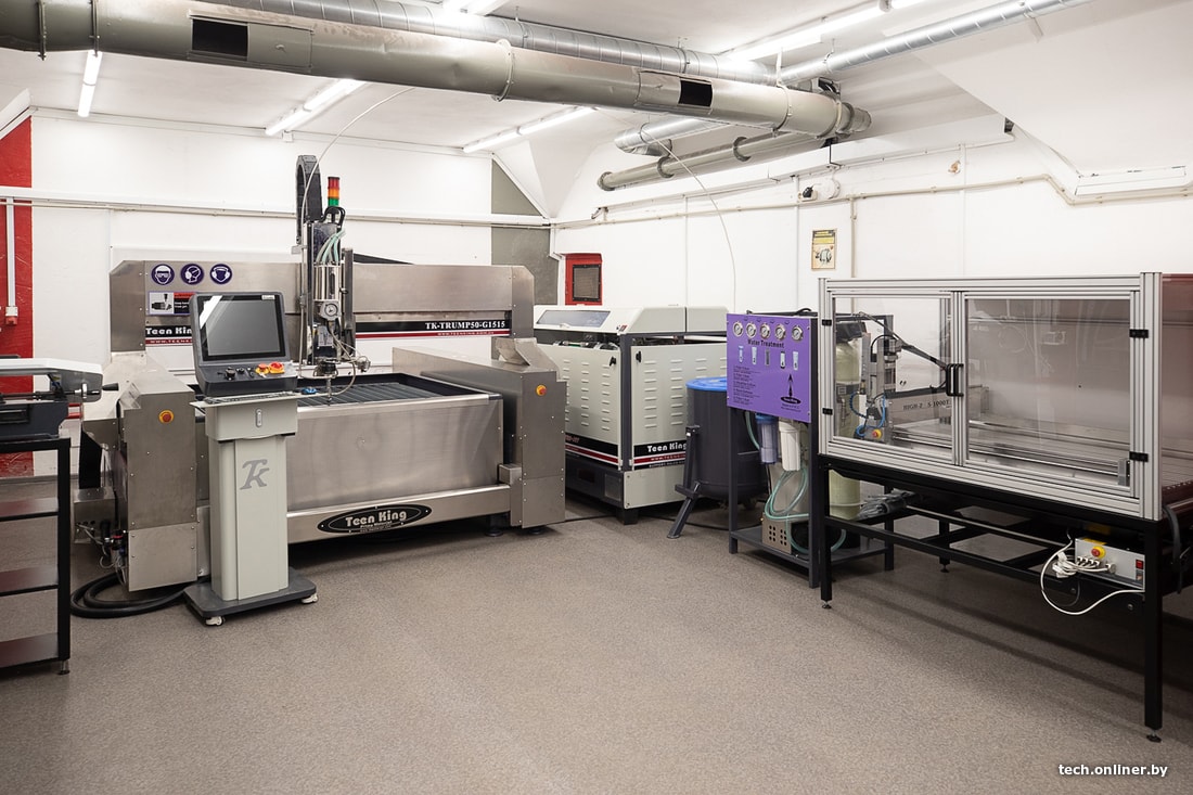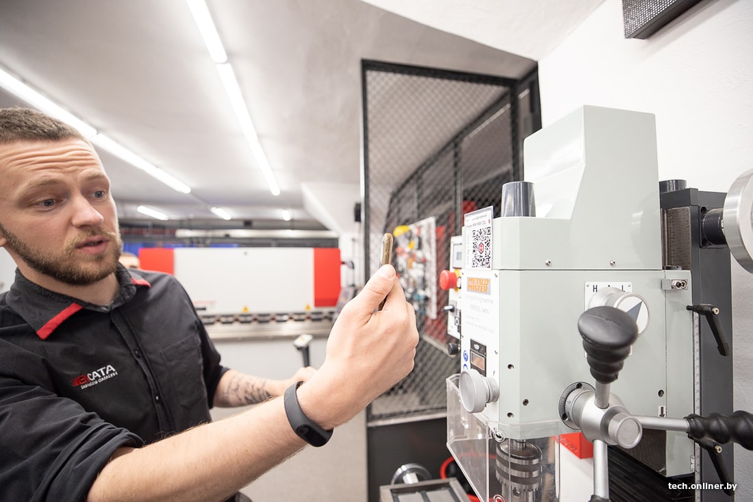 — Все построено таким образом, что нанести себе вред вы не сможете. К примеру, для работы пресса нужно зажать ногой педаль, а рукой кнопку. В итоге у вас одна свободная рука, которой будете держать деталь. Оставить элемент просто не получится. И так устроено все. Исключена ситуация, когда человек с допуском включил станок и дал младшему брату поработать — у каждого пользователя будет метка в виде браслета, и администратор следит за обстановкой.