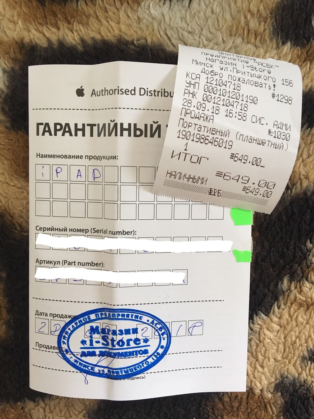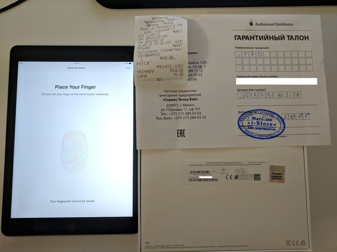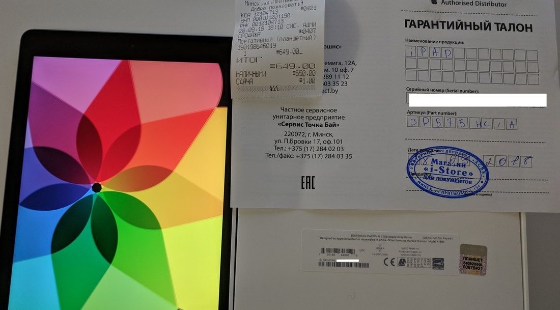 — На кассе продавец не поставил в известность о том, что это демоверсия с критическими ограничениями в функциональности устройства. Также в гарантийном талоне ни слова о демоверсии не написано. Упаковочная пленка на коробке была немного надрезана, след надреза присутствует и на самой коробке. После распаковки на корпусе iPad видны пятна грязи, что крайне странно для абсолютно нового устройства, купленного у крупнейшего в Минске Apple Premium Reseller, — рассказала девушка.