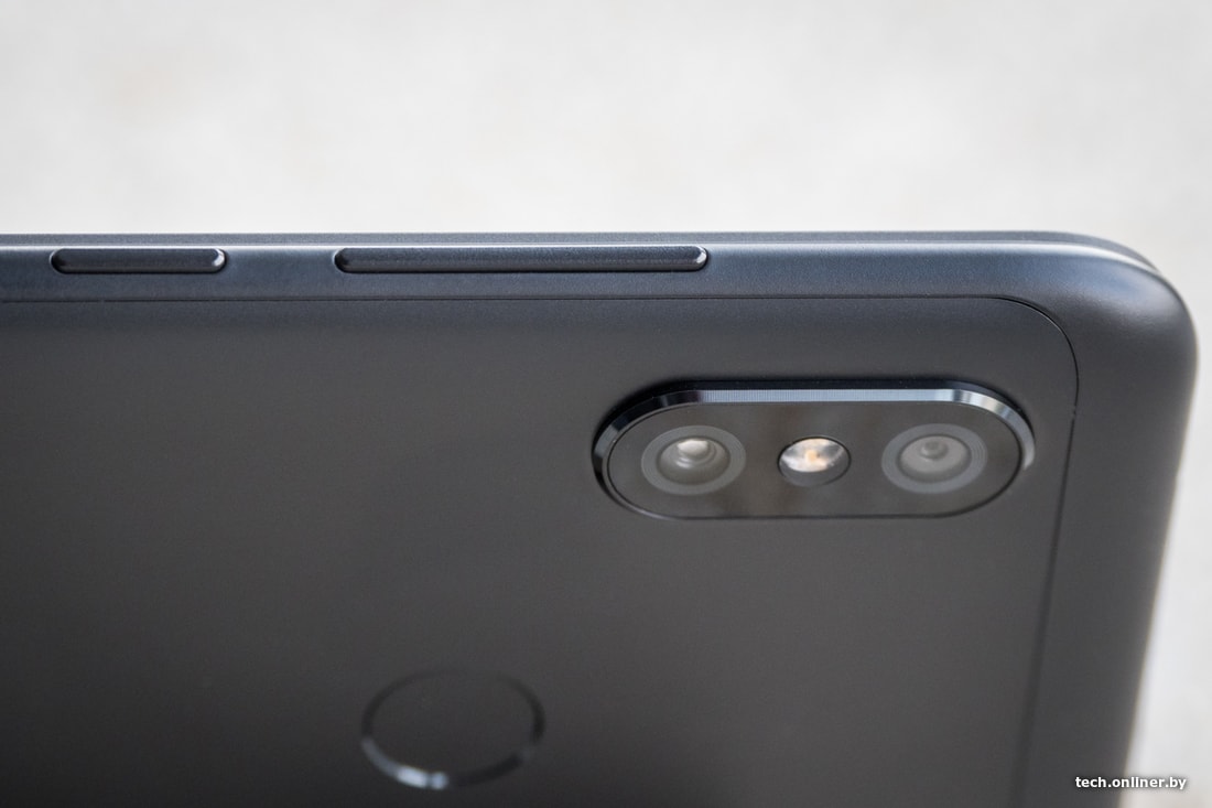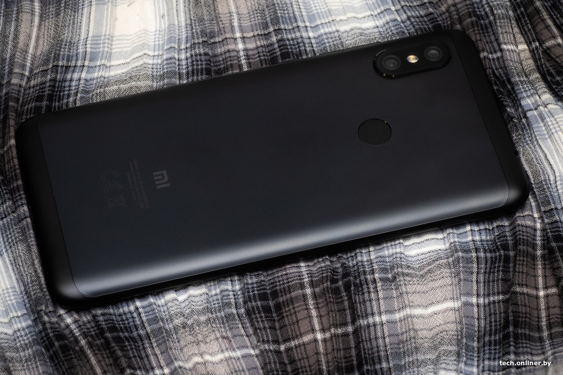 У Redmi Note 6 Pro — темная поверхность с незаметным сканером отпечатков и модуль двойной камеры слева вверху. Едва проглядывает логотип Mi.