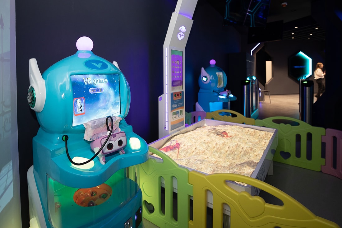 Среди игровых зон есть детская (от 4 лет). Ребята могут поиграть с терраморфингом — допустим, можно раскопать реальный песок, найти виртуальный подземный источник и вырыть озеро, куда стянется местная живность. Кроме этого, есть тир (бросаемся игрушками) и другие развлечения для детей.