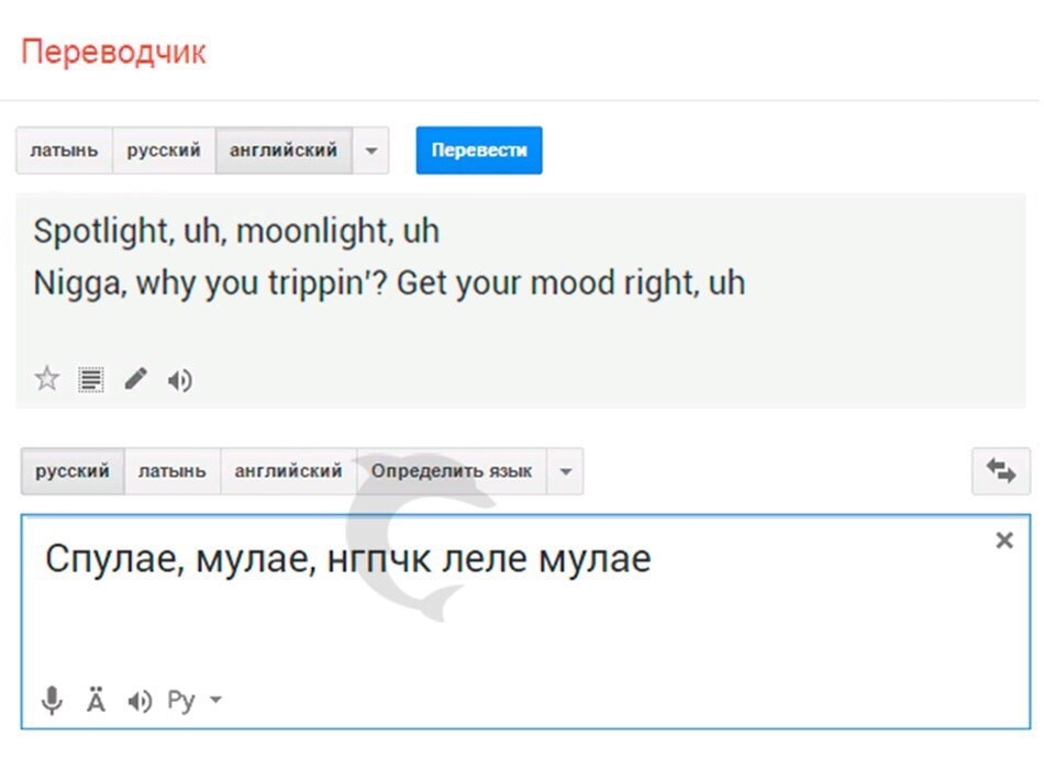 Когда афроамериканский рэпер исполняет трек на английском языке, его бывает трудно понять не только русскоязычному человеку, но и другому американцу. Такая беда приключилась с треком Moonlight ныне почившего рэпера XXXTENTACION. Строчку «Spotlight, uh, moonlight, uh...» и последующие он произносит довольно неразборчиво. Пользователи рунета, услышавшие ее где-то краем уха, интересовались в интернете, как найти трек, где поется что-то наподобие «Спалая мулая ипекч мурая спалай мурааай». В конце концов этот неразборчивый трек стали форсить во «ВКонтакте», за счет чего он и обрел популярность.