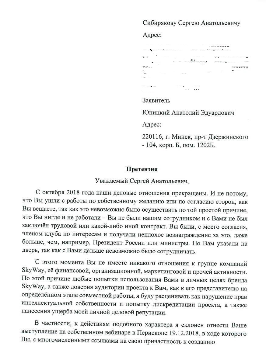 «В Вашем [Юницкого. — Прим. Onliner] окружени последнее время появилось много странных для меня людей, поэтому мне представляется этот документ чьей-то жалкой попыткой поссорить меня с Вами, чтобы спровоцировать на какие-то публичные заявления и раскрытие какой-то информации, которая бы для Вас и проекта SKYWAY была бы крайне нежелательной, так как вполне может расколоть аудиторию инвесторов, расстроит налаженную инвест-проводящую систему, создать условия для Вашей изоляции и в итоге превратить Вас в финансово зависимого изобретателя, как 5 лет назад».