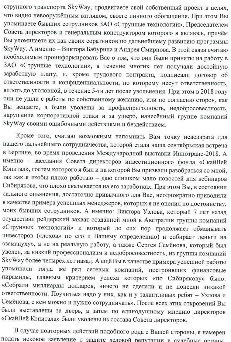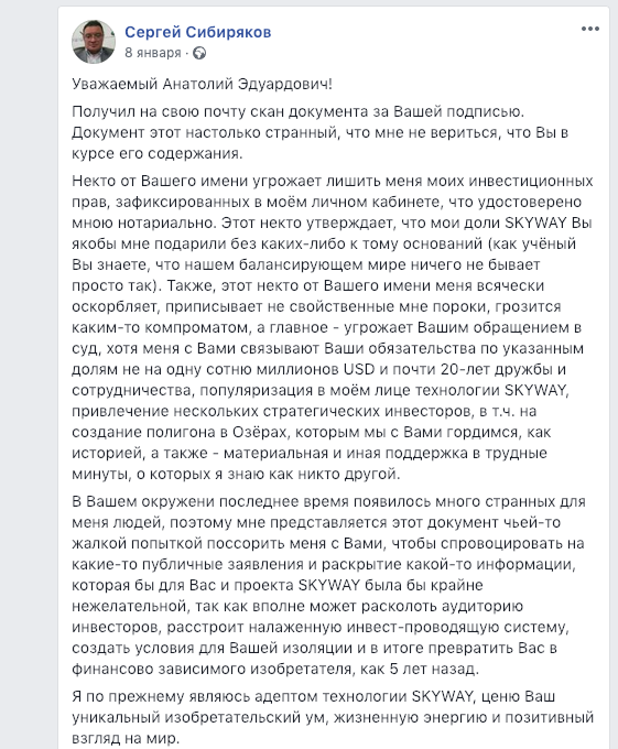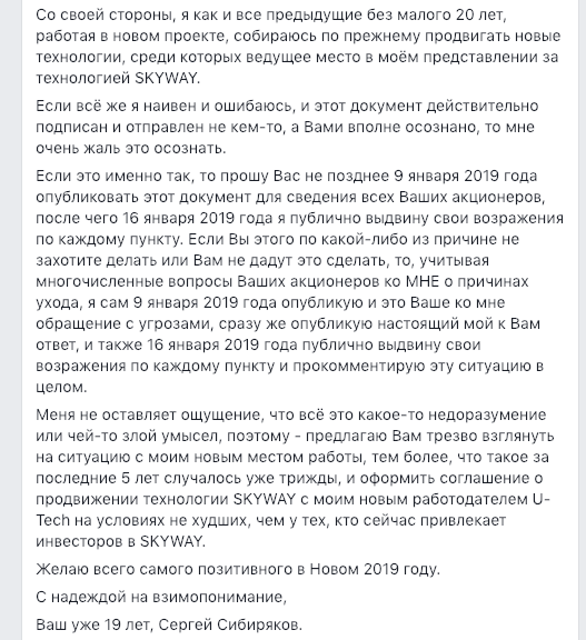Сергей Сибиряков в стороне не остался и также опубликовал в общем доступе письмо. Футуролог возмущается, что его грозятся лишить долей SkyWay. Есть и завуалированное предостережение от дальнейших «наездов» (орфография и пунктуация также сохранены):