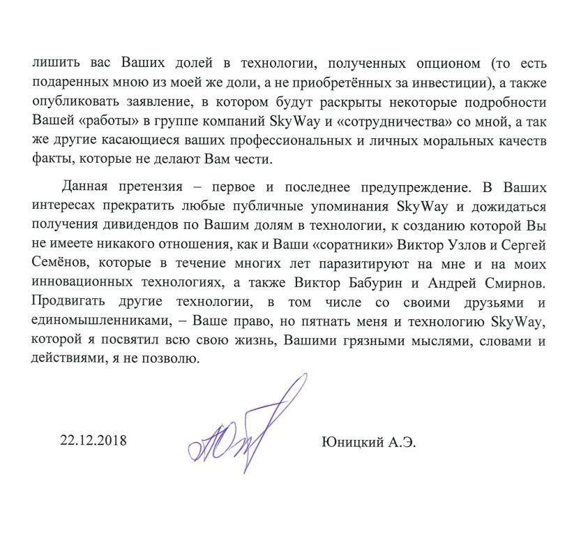 Далее футурологу вменяется некое «сильное опьянение», призывы разобраться с автором струнного транспорта и ориентация на финансовые пирамиды. «В случае повторных действия с Вашей стороны, я намерен [...] опубликовать заявление, в котором будут раскрыты некоторые подробности Вашей „работы“ в группе компаний SkyWay и „сотрудничества“ со мной, а так же другие касающиеся ваших профессиональных и личных моральных качеств факты, которые не делают Вам чести», — говорится в обращении (орфография и пунктуация сохранены). Там же упоминаются и другие соратники Юницкого, о которых с осени прошлого года ничего не слышно.
