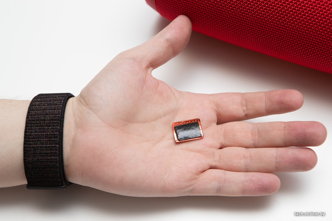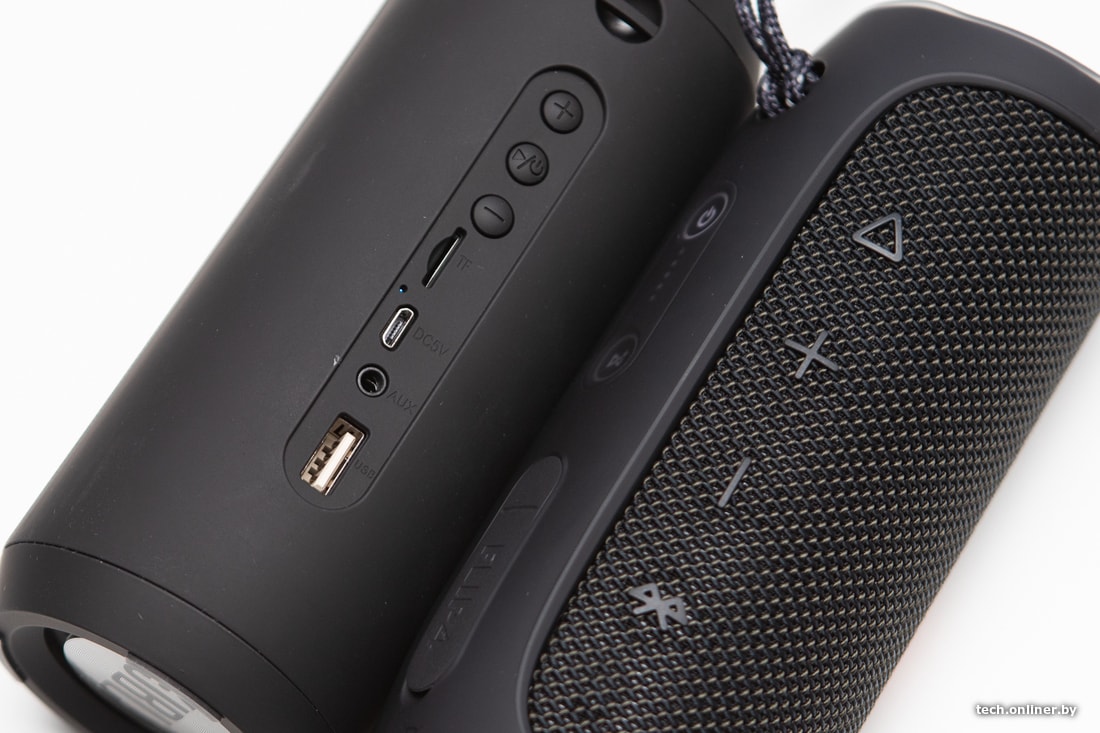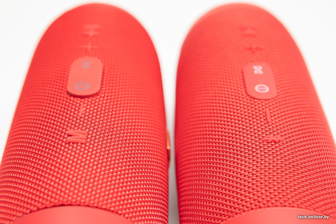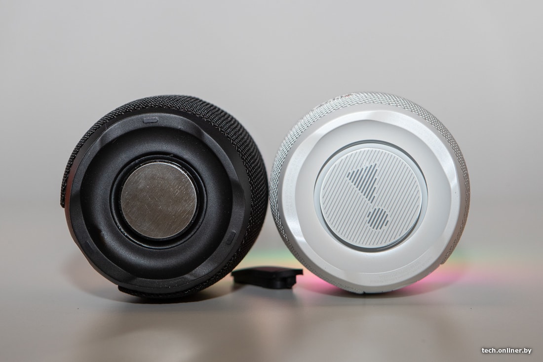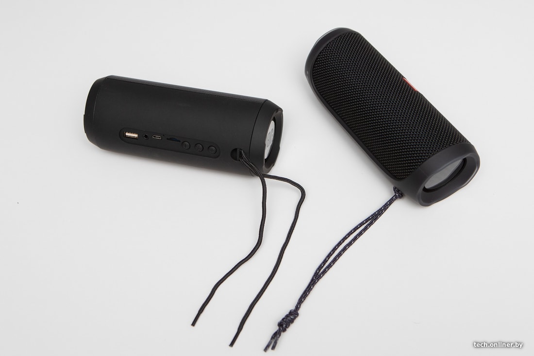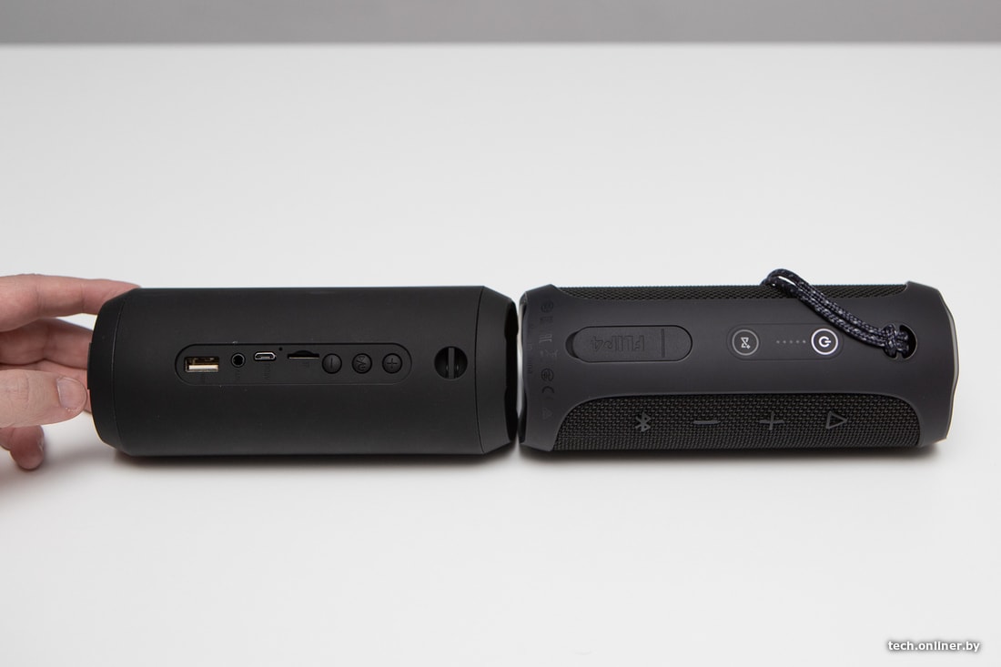 Пусть в упаковках нет ни одной общей черты, внутри находится колонка, старательно копирующая Flip 4. Да, вместо ткани жесткий, неприятный на ощупь липковатый пластик, он же вместо прорезиненных проушин. На динамики с обеих сторон заботливо приклеена имитирующая металл пленка с указанием бренда.