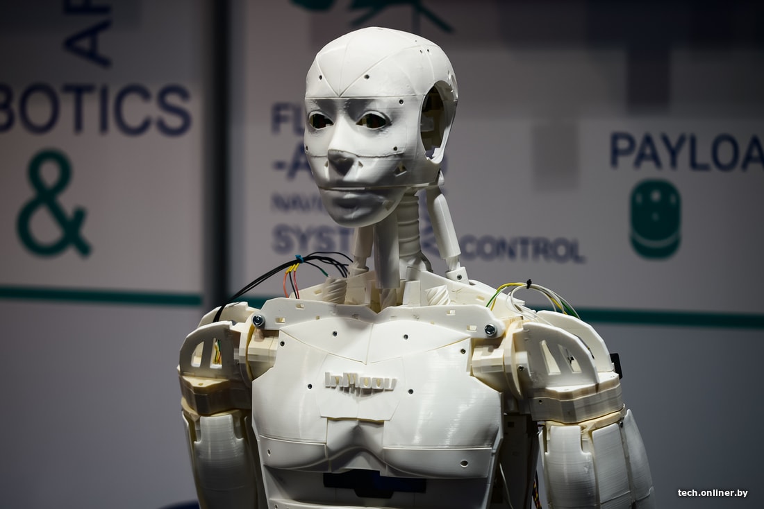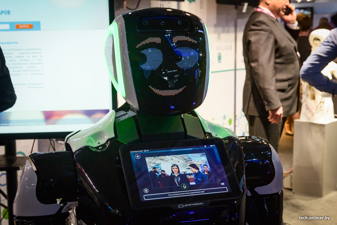 Где-то ближе к центру мы заметили немного человекоподобного робота — умеет говорить, рассказывать анекдоты. Массивный, красивый, с сенсорным экраном и запоминает лица. Кого-то из подошедших назвал «красавчиком». Просто так. Забавно, но пока распространения не получили эти умные машины, они все так же остаются выставочными экземплярами.