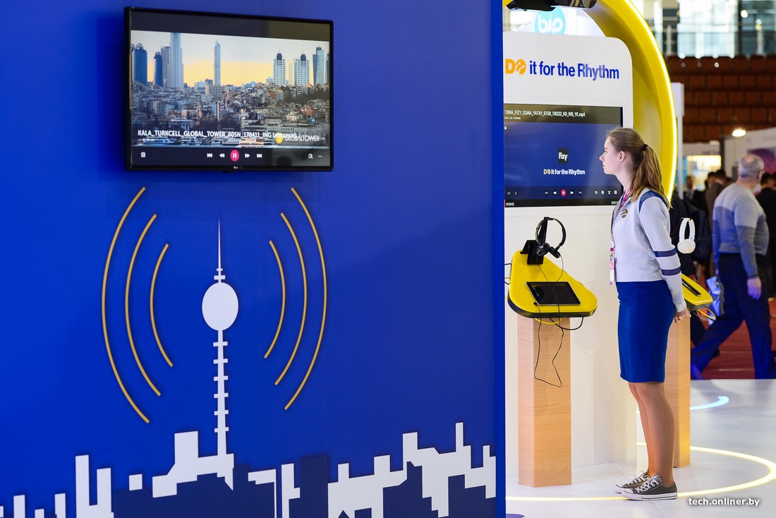Оператор velcom | A1, в свою очередь, с помощью гаджета рассказывает о 5G, запустив прямую трансляцию с панорамной камеры под потолком. Специалист компании вещает о преимуществах «антенны» с 64 приемопередатчиками, способной позиционировать отдельного абонента направленным сигналом. Система одновременно справляется с трансляцией «по воздуху» 16 HD-каналов и данных для очков виртуальной реальности.