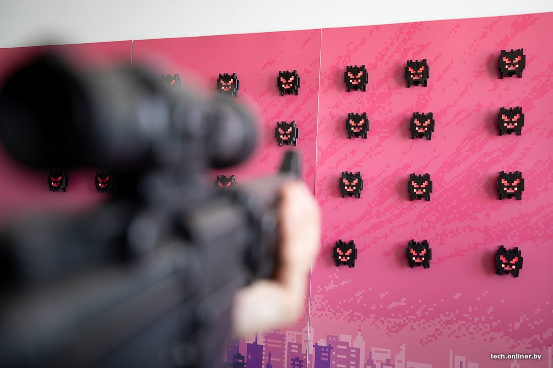 Сейчас идея проекта представлена в виде игрового стенда. На полотне во всю стену закреплены маленькие устройства с диодами. Они связаны в одну систему. При старте загорается один элемент, и если быстро в него не выстрелить из игрового автомата, начнется активация находящихся рядом устройств, и так далее по принципу домино.