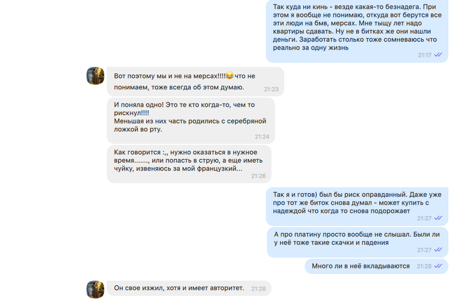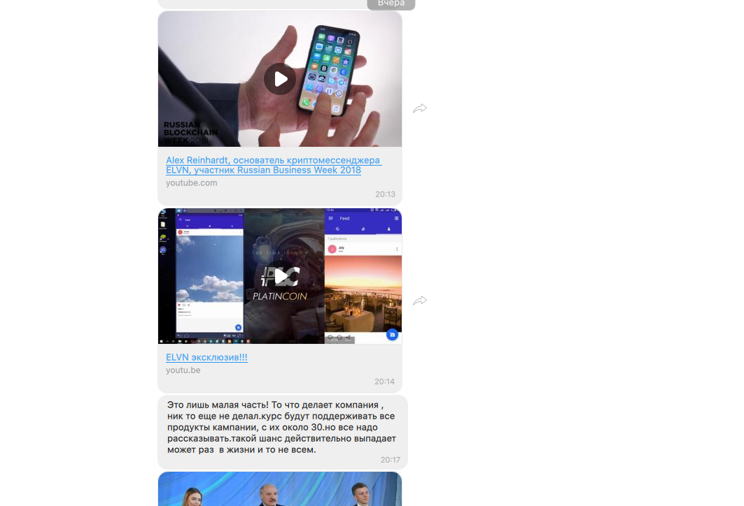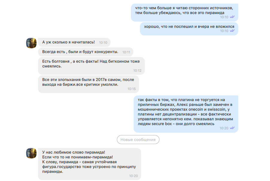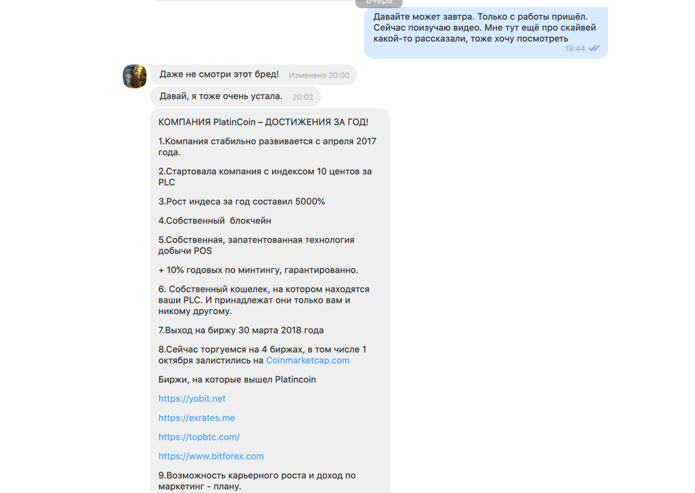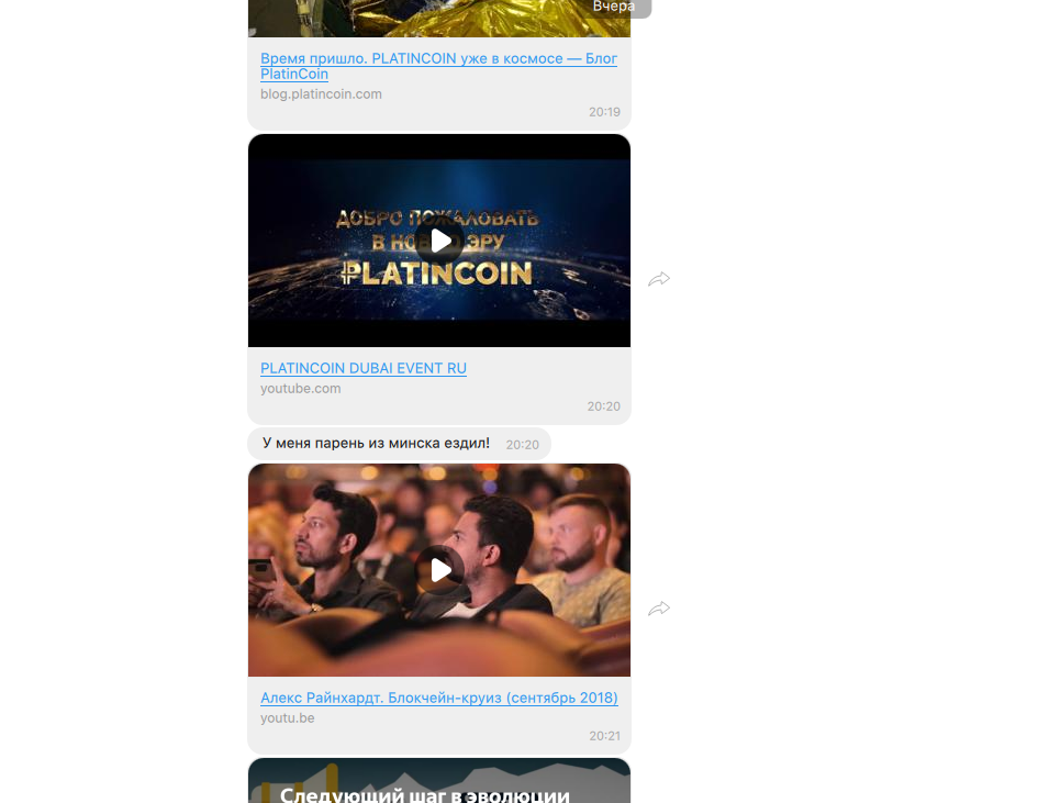 Конечно, каждый может ошибаться, но исходя из моего понимания активность Platincoin и Алекса не похожа на то, как ведут себя блокчейн-проекты. Здесь только и разговоров о том, что надо поскорее вложиться, чтобы заработать».