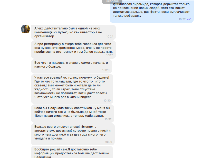 В конце концов мы созвонились, и криптовалютчица назвала контактные данные некой столичной пенсионерки Валентины. Она, говорит, много где активничает, в том числе в SkyWay, но ты ей скажи, что принес наличные именно на Platincoin. На прощание Анна рассказала о том, как долго не могла продать автомобиль, а когда сделала это, то поняла — все деньги надо вкладывать в новую криптовалюту. О том, что ее брат со своей многодетной семьей долго сомневался, но в итоге тоже вложился. О том, что курс «платины» искусственно сдерживается, потому что крипте надо выйти на рынок США, где МЛМ запрещен. О том, что можно заработать также на реферальной системе, приглашая вложиться друзей, знакомых и так далее.