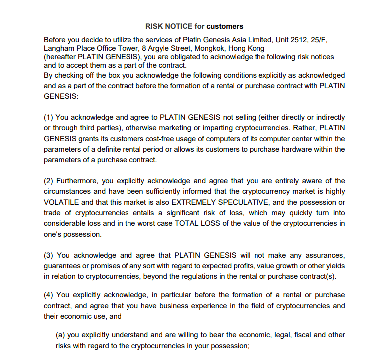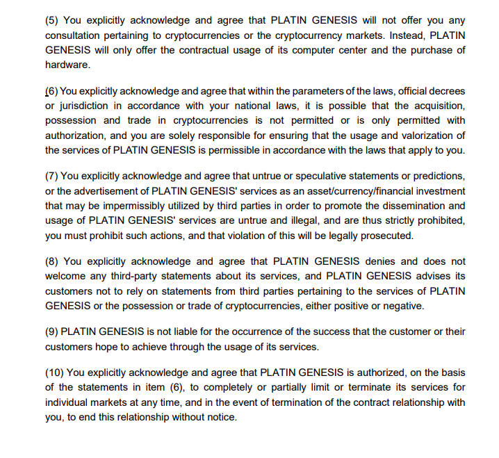 White paper, то есть официальной документации, подробно описывающей Platincoin, на видном месте нет. Сама она больше похожа на прикольную презентацию, а не на серьезный документ. Зато есть вот такой важный документ, в котором ясно говорится, что можно все потерять, и никто никакой ответственности ни за что не несет.