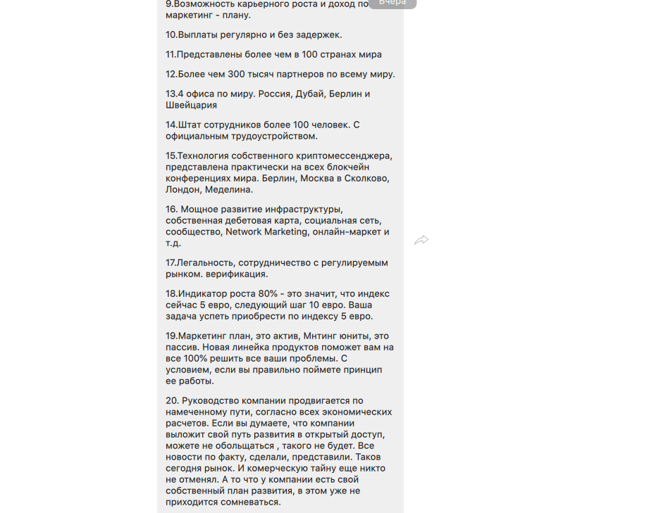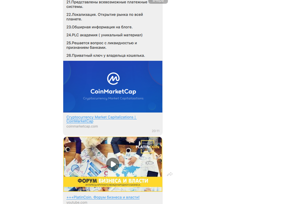 Тяжелая артиллерия в виде тонны ссылок на всякие вебинары, семинары, рекламные ролики и вдохновляющие речи успешного руководства заставила меня замолчать на сутки. Почуяв неладное, Анна выудила из закромов убийственный аргумент, метровый гвоздь в дощатую крышку моих сомнений. Список из 26 аргументов, почему Platincoin — это хорошо. Стабильность там, блокчейн, выход на биржи, рефералочка, 100 человек в штате и 300 тысяч партнеров по всему миру, умный директор и все такое прочее.