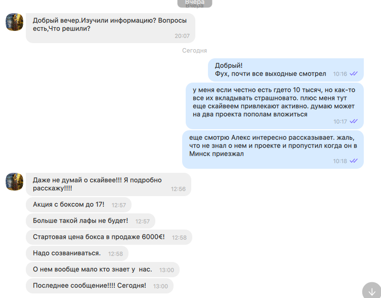 Нет, Анна, не скайвеевцы. На том и распрощались. Еще были попытки переубедить меня видео с какими-то особенно успешными гуру Platincoin. Но я кремень. Деньги вкладываю в себя и свою семью.