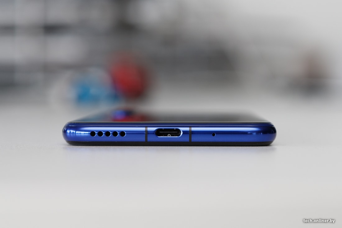 Слот для карты памяти все еще не завезли, вместо него здесь две ячейки для SIM-карт. Ладно, слот с такими объемами встроенной памяти не нужен, а вот отсутствие стереодинамиков — это зря. Смартфон звучит точь-в-точь как Honor 10. То есть услышать вызов позволит, а вот выступить в роли компактной колонки не сможет. Для зарядки используется теперь уже стандартный разъем USB-C.