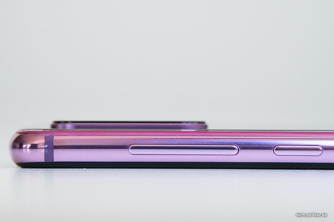 Стекло на передней панели защищено полоской пограничного пластика, которая в свою очередь примыкает к скругленной металлической рамке устройства. В нашем случае это рамка фиолетового цвета и абсолютно обыденного содержания. На правой грани находятся кнопка блокировки экрана и качелька громкости, на левой — лоток для nanoSIM-карт. По привычке может показаться, что один слот сгодится для карты памяти microSD, но смартфон не поддерживает расширение встроенного хранилища.