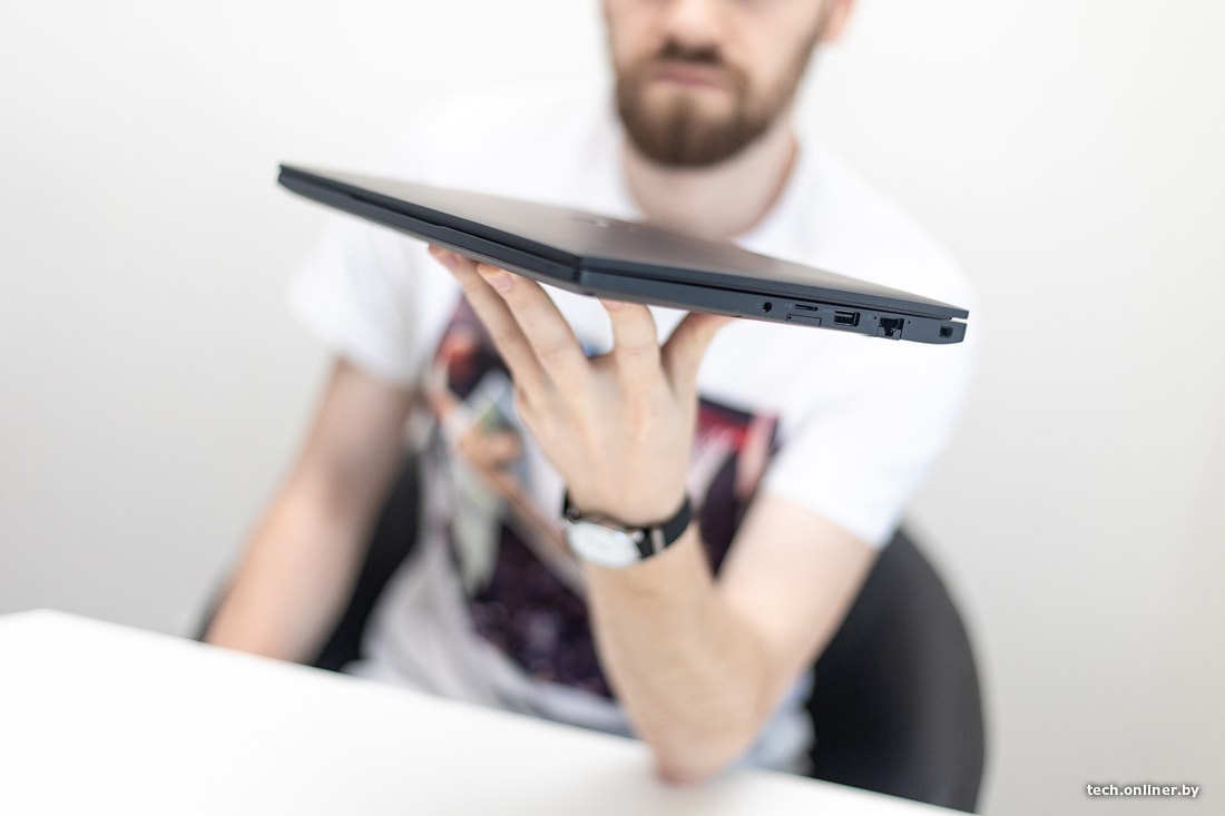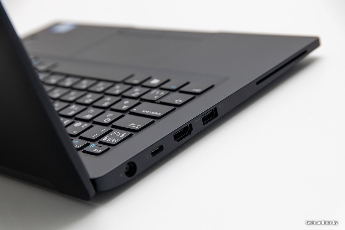 Время работы от одного заряда проверялось с запущенной Visual Studio, двумя браузерами и большой таблицей Excel. Результат — 6 часов. В комплекте идет компактный блок питания, с ярким светодиодом на штекере. Ноутбук, если нужно, заряжается через USB C. В такой ситуации отдельный адаптер не выглядит бесполезным решением, ведь порт USB C остается свободным для полезных дел, пока устройство питается от обычного адаптера.