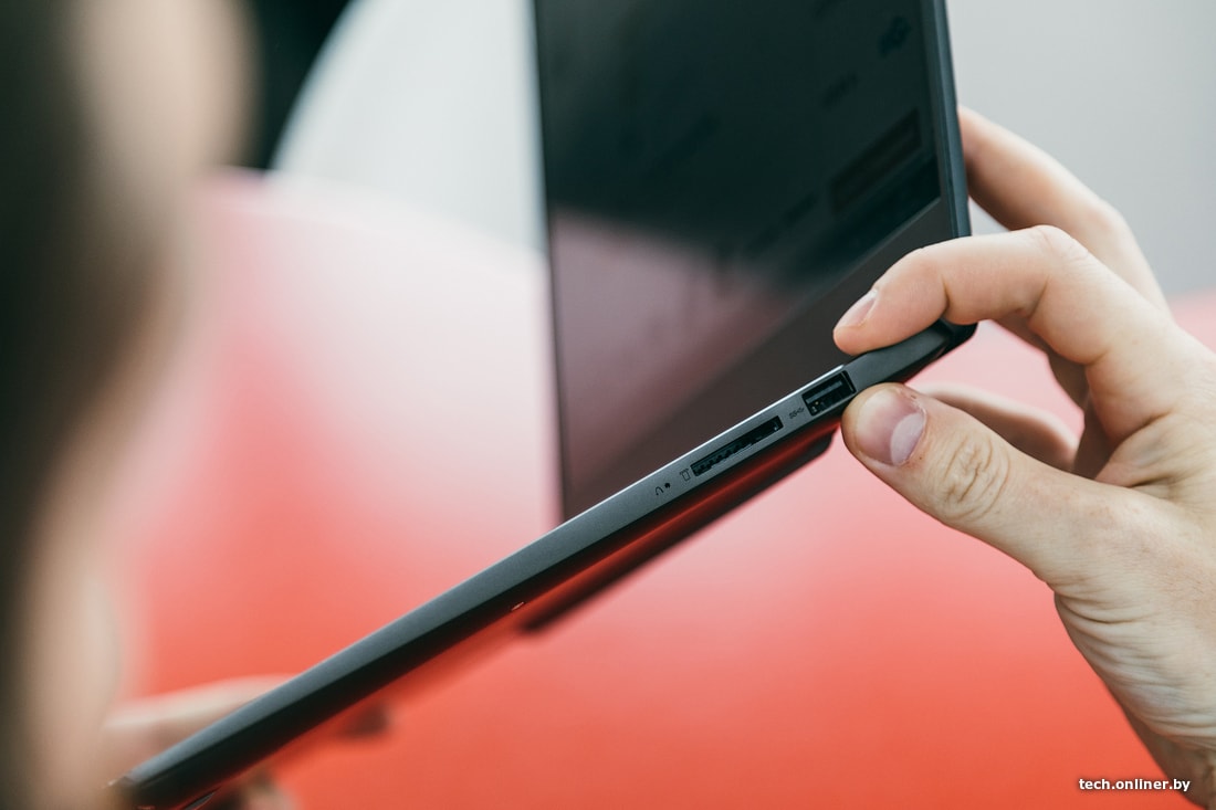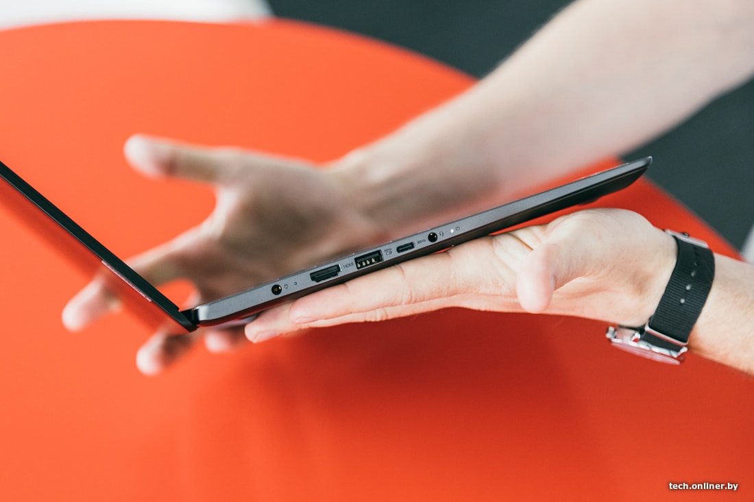 Ноутбук выглядит стильно и привлекает минимализмом оформления: без узоров, эффектов шлифовки и броских логотипов. 14-дюймовый экран уместился в очень тонких рамках с трех сторон. Матовая черная крышка имеет косой срез с передней стороны для удобства открывания. Одной рукой это нельзя сделать, зато за счет прочного крепления экран не трясется при работе в дороге, например в маршрутке. Как видно на фото, корпус маркий и собирает много отпечатков по всей поверхности. На боковых гранях темно-коричневого корпуса уместились два USB 3.0, USB Type-C, HDMI и картридер.