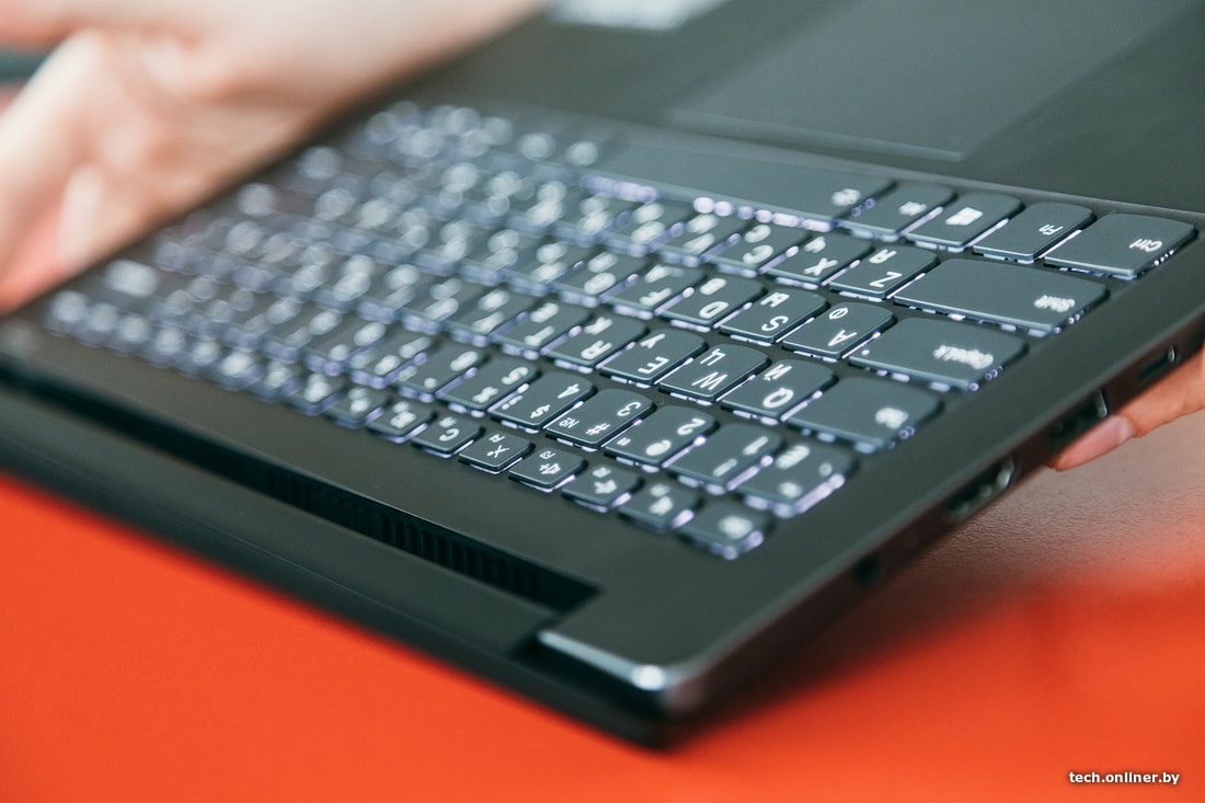 Клавиатура без цифрового блока оснащена двухуровневой подсветкой, которая почему-то переключается с едва заметной задержкой во времени. Клавиша питания вынесена за пределы, а стрелки «вверх» и «вниз» уже традиционно уполовинены. Работать на клавиатуре IdeaPad 530s приятно, ход клавиш короткий и мягкий с небольшим эффектом подпружинивания.