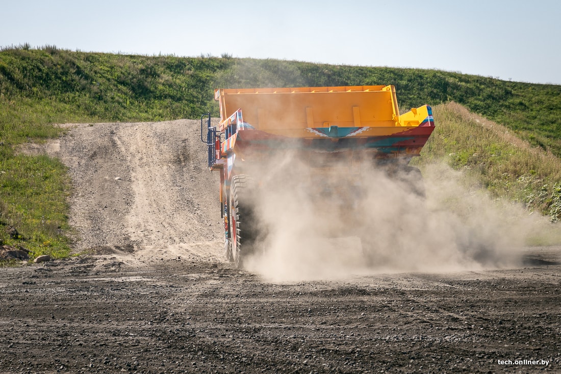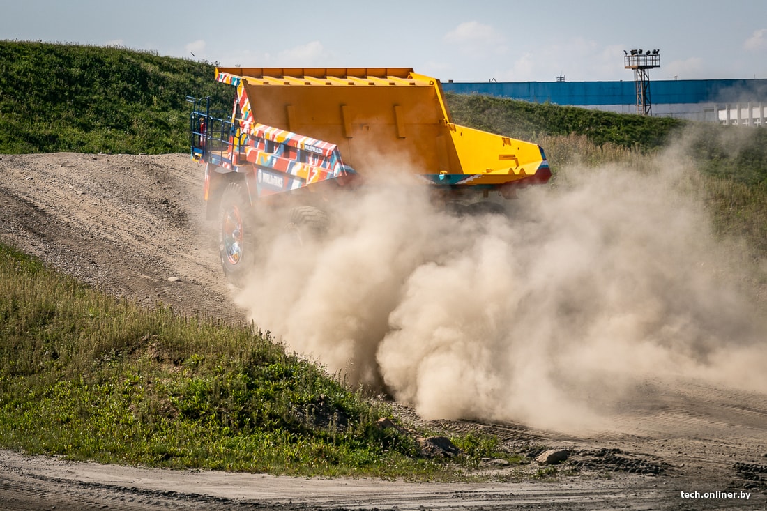 Уникальную раскраску получила модель БелАЗ-75585. Это карьерный самосвал грузоподъемностью 90 тонн. Высотой он 5,34 метра, в ширину — 6,4 метра, а пустой грузовик весит 74 тонны (примерно два танка Т-34-85). Скоро этот экземпляр перевезут в российское представительство БелАЗа для продажи.