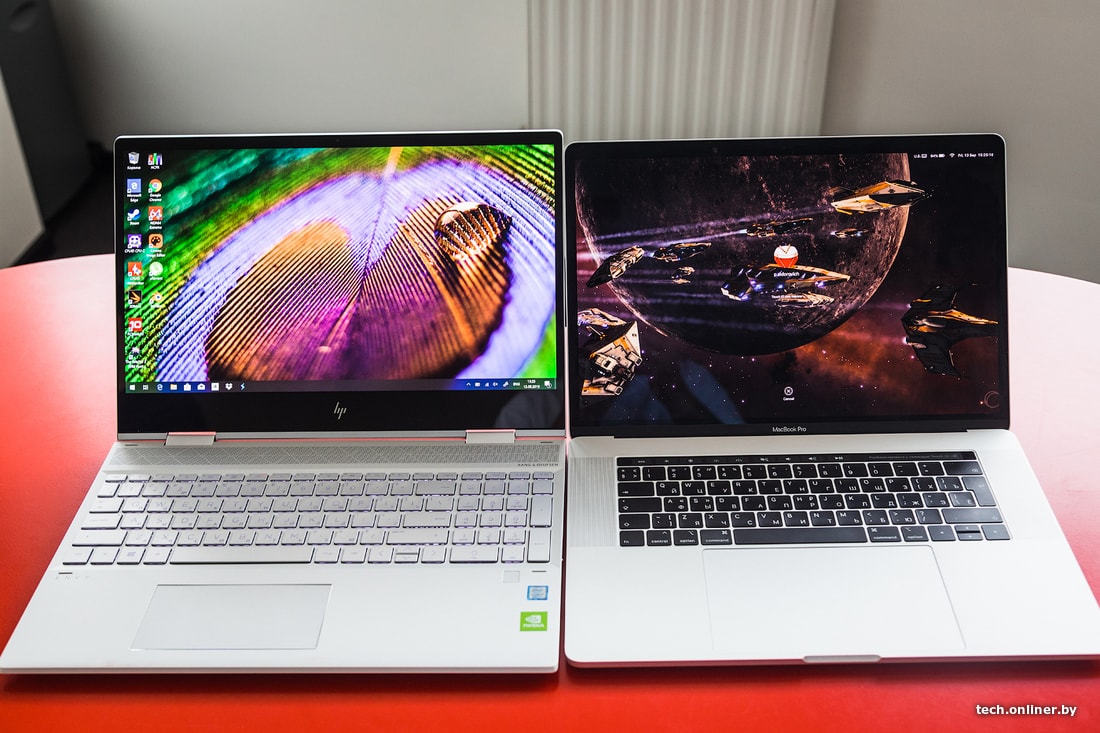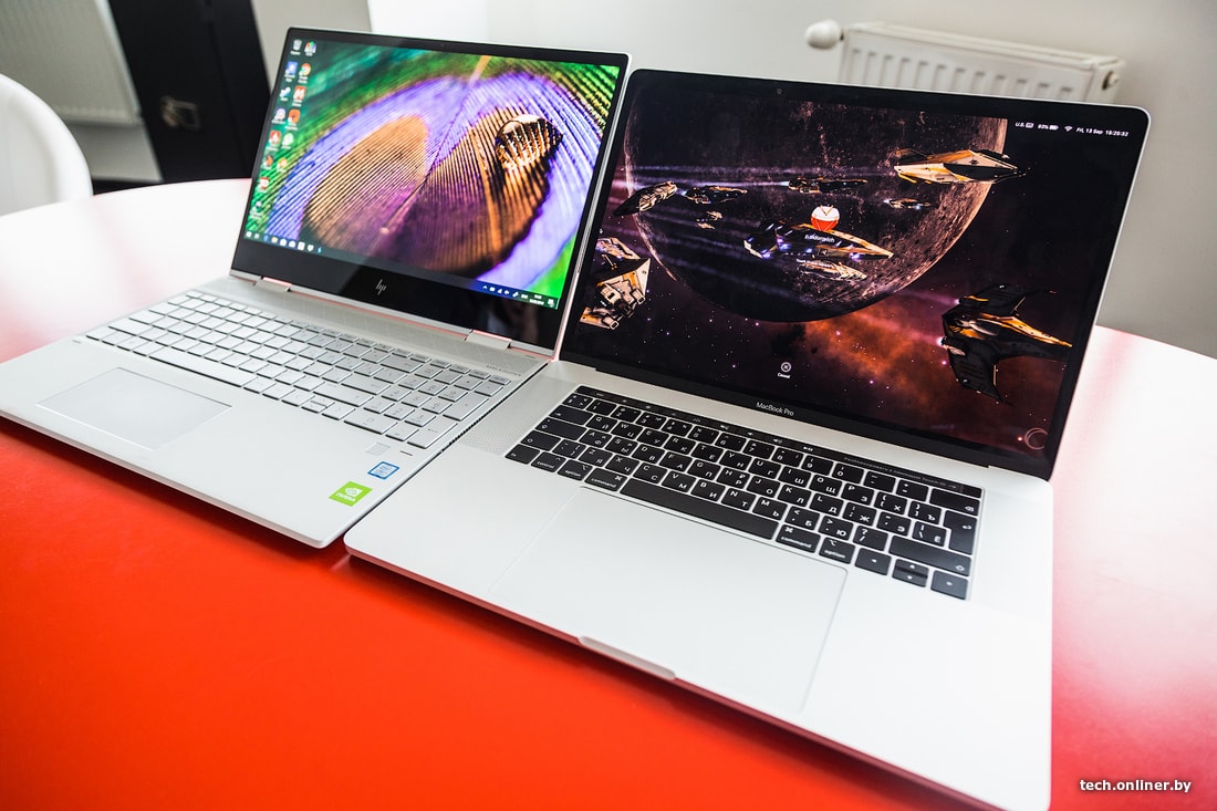 Когда-то про смартфоны говорили, мол, не нужно большое разрешение (1080p+), с такого расстояния все равно не видно разницы. Оказалось, и разницу нашли, и телефоны такие стали покупать. Теперь ситуация повторяется в ноутбуках. Правда, 4К остается пока привилегией топовых устройств и не спешит в народ. А уж OLED тем более. Контент в высоком разрешении непосредственно на HP ENVY смотрится отлично. Крупные планы в тарантиновской «Омерзительной восьмерке» поражают своей детальностью. К сожалению, не было возможности сравнить с топовыми IPS-панелями. Для небольшой наглядности поставили рядом с HP «прошку» от Apple. Если на фото разница может быть не так очевидна, то «вживую» она была ощутимо в пользу HP.