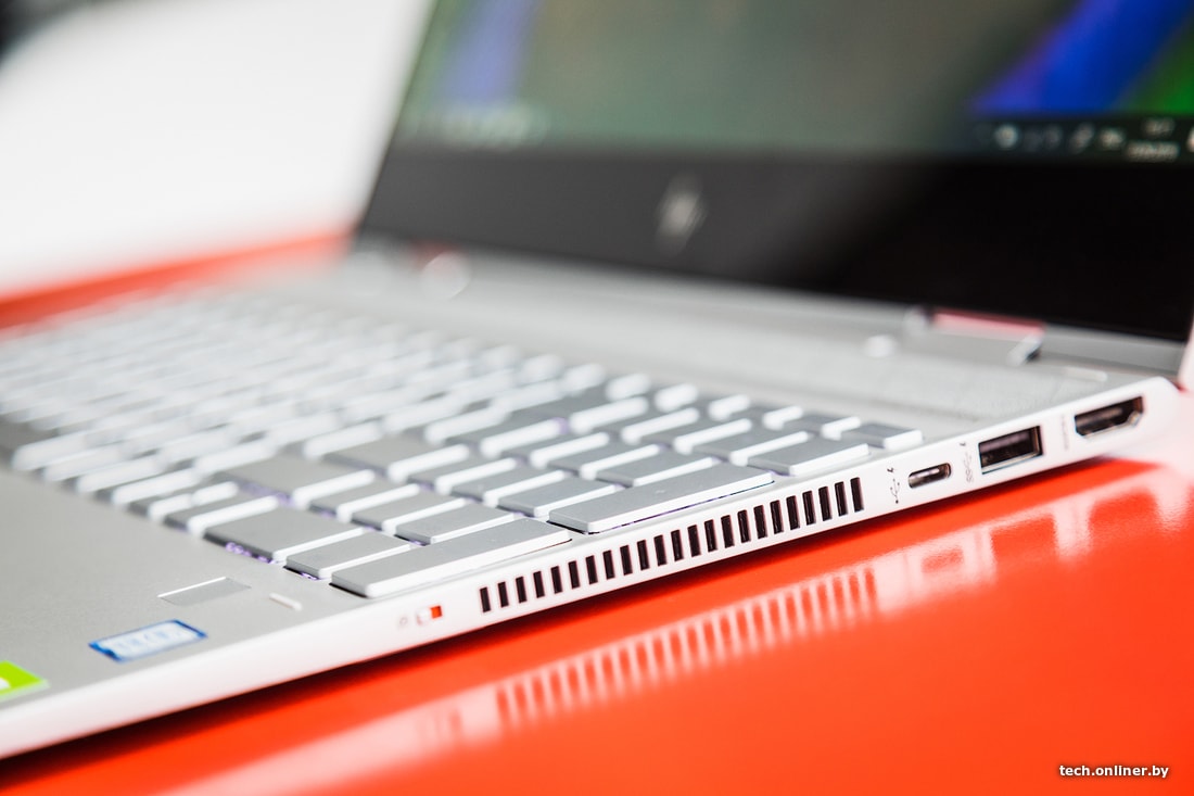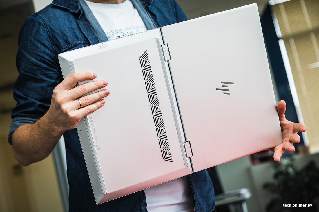 HP ENVY x360 — металлический ноутбук весом 2 кг с большим тачпадом и двухуровневой подсветкой. Острые края, узорная решетка с двумя динамиками над клавиатурой, тонкие рамки экрана (кроме нижней) и минималистичное оформление клавиатуры и упора для рук. Сама клавиатура, кстати, имеет приятный отклик клавиш, схожий с клавиатурами HP Pavilion. Здесь снова уполовинены клавиши навигации, но зато кнопка включения вынесена на боковую грань. Бестолковая кнопка вызова «Справки» по-прежнему на своем месте.