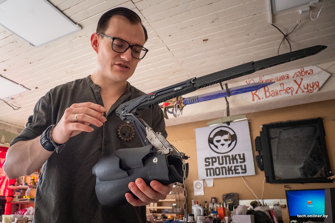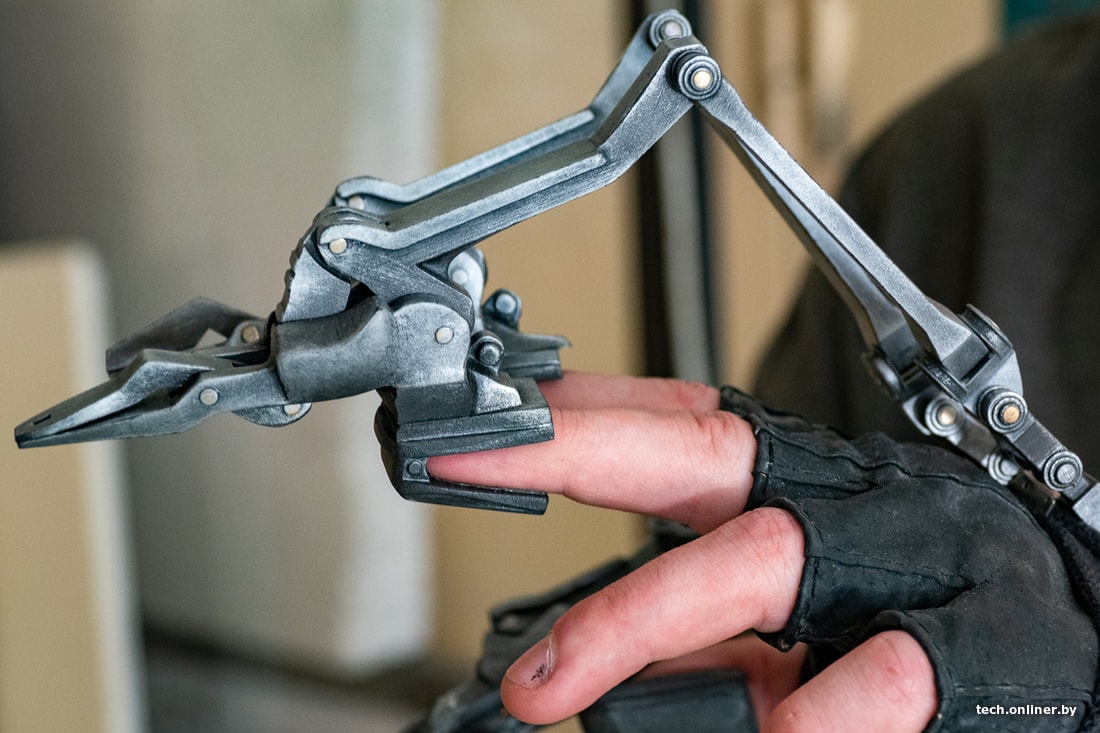 «Вообще, это самая сложная чертовщина, в которую я когда-либо ввязывался в своей жизни. Страшно мудрый рабочий прототип встроенного в руку клинка, который должен выпрыгивать из предплечья и раздвигаться (что и делает. — Прим. Onliner). На все у нас ушло недели две с небольшим. Я сам не верил, что это возможно».