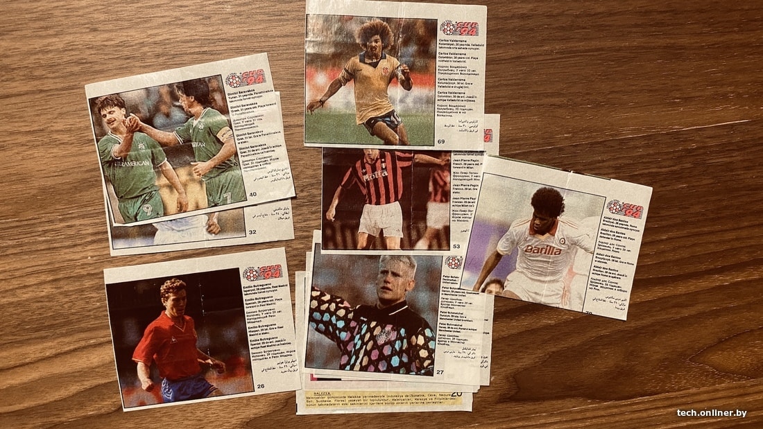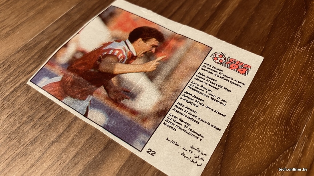 Тематически схожей была жвачка CUP 94. Выходила она уже после Final и покупалась как ее наследница. Здесь были более подробные пояснительные подписи, к тому же на разных языках, включая русский. Выглядело это примерно так: «Джон Йенсен (имеется в виду Йон Йенсен. — Прим. Onliner), датчанин, 27 годищен, игрое полузащитник в Арсенал».