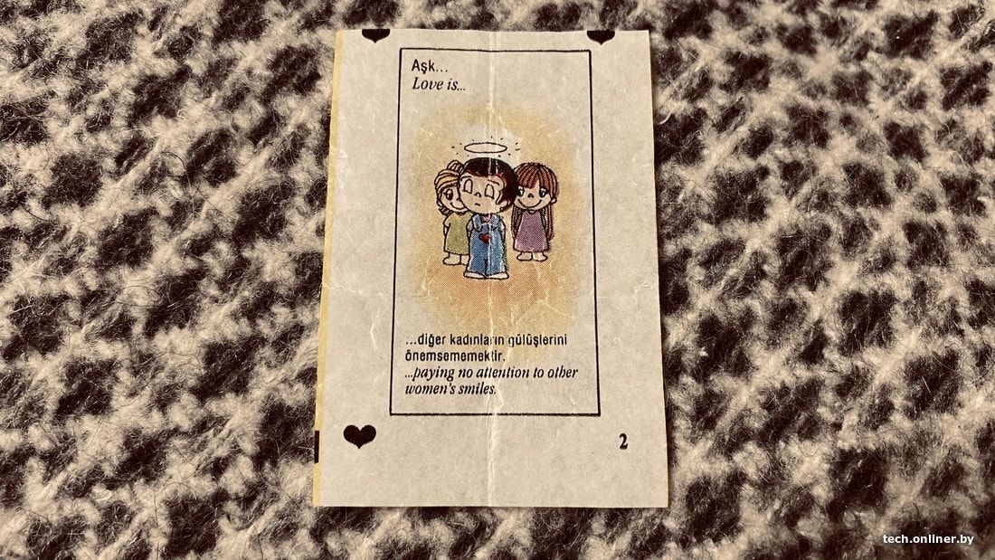 Классика, живая поныне. Не плоские, а квадратные, да еще с двойным вкусом (например, шоколад и дыня) и милыми зарисовками на тему любви. Жвачка была очень раскрученной. Международная направленность видна с первых же выпусков, в которых турецкие надписи дублировались на английском. А где-то с 1993 года добавилась русскоязычная версия. Именно благодаря им миллионы девчонок и мальчишек узнали, что любовь — это «не замечать морщин у ее глаз», «пропустить половину фильма в поисках ее туфельки» и так далее.