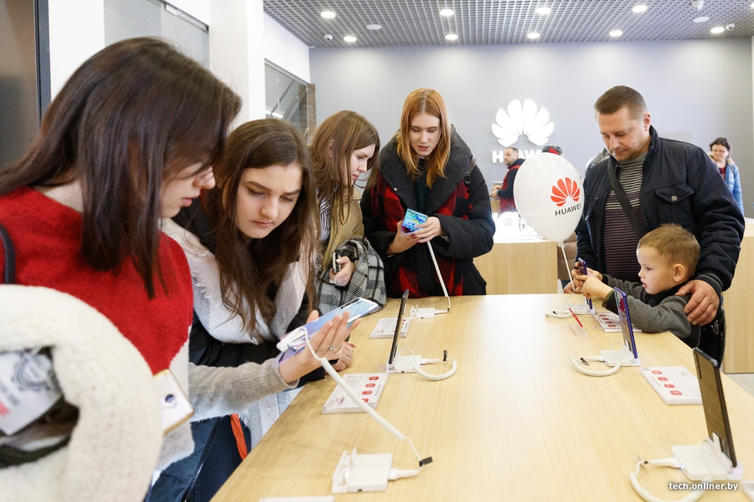 Сегодня компания Huawei официально открыла второй фирменный магазин в Минске. Новый брендшоп площадью около 100 квадратных метров расположился в ТЦ «Корона-Сити» на Денисовской, 8. Здесь представлена вся продукция, которую выпускает компания. По традиции открытие сопровождалось конкурсами, викторинами и подарками. Посмотреть на торжество и побороться за призы пришло несколько десятков человек (в основном молодежь), но до столпотворений, которые бывают во время запуска продуктовых супермаркетов, конечно, еще далеко: все-таки аудитории разные.