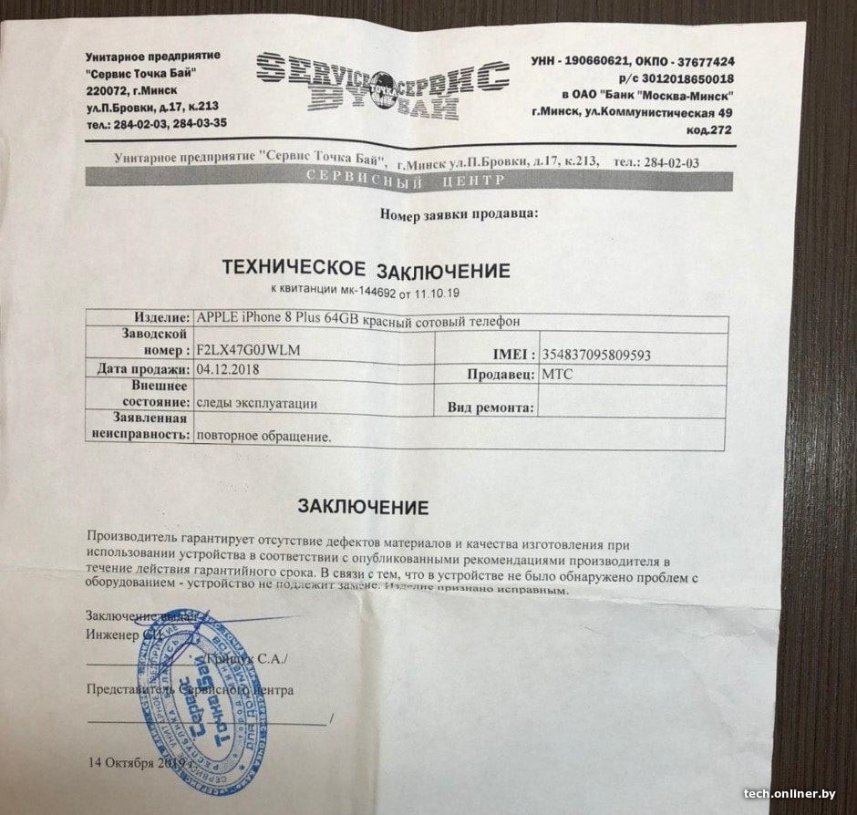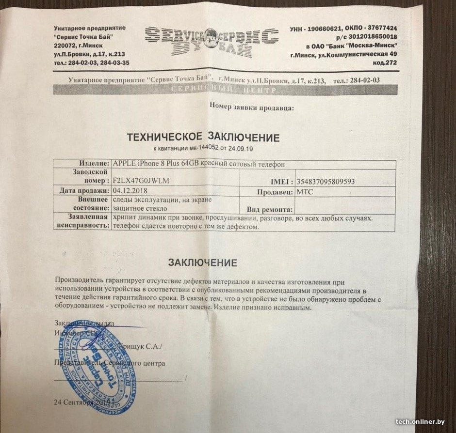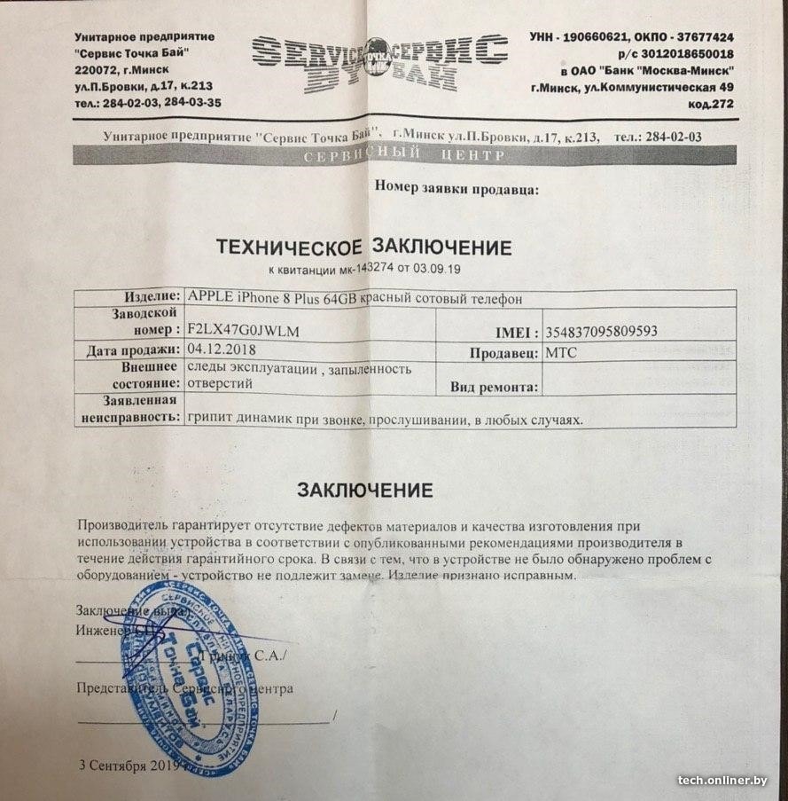 В редакцию Onliner обратилась читательница, которая захотела рассказать о своих неудачных попытках на протяжении нескольких месяцев решить вопрос с барахлящим динамиком в iPhone 8 Plus. Смартфон она покупала в салоне связи МТС в декабре 2018 года. В августе 2019 года из разговорного динамика на максимальной громкости стали доноситься хрипы. Девушка отправилась в салон МТС, телефон сдали в сервисный центр.