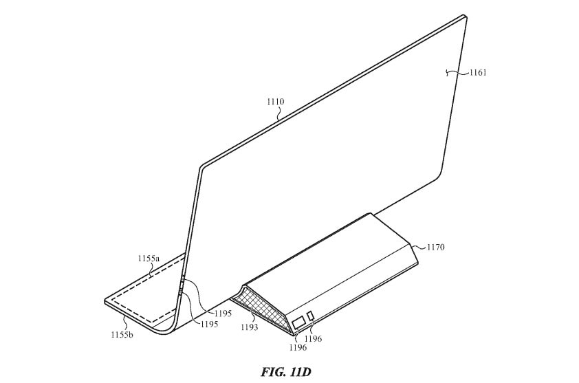 Патент также предусматривает использование Macbook как док-станции: нижняя часть ноутбука проходит через отверстие в корпусе, а изображение передается на дисплей моноблока.