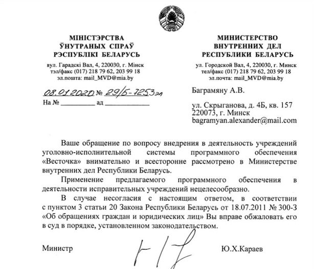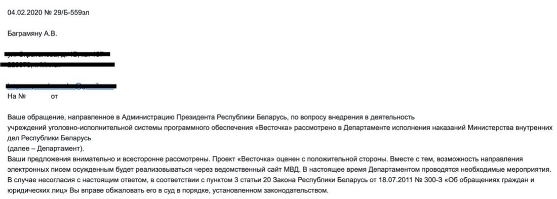 Позиция госорганов относительно «Весточки» неоднозначная. Сперва, в начале января, МВД назвало внедрение сервиса «нецелесообразным». Разработчики снова направили запрос и попросили прокомментировать: что именно нецелесообразно? Но уже в феврале Департамент исполнения наказаний отметил, что проект изучен и «оценен с положительной стороны» — правда, вводить его все равно не планируется.