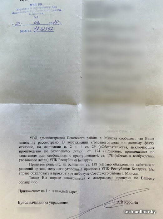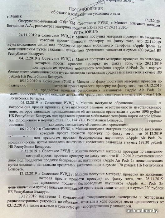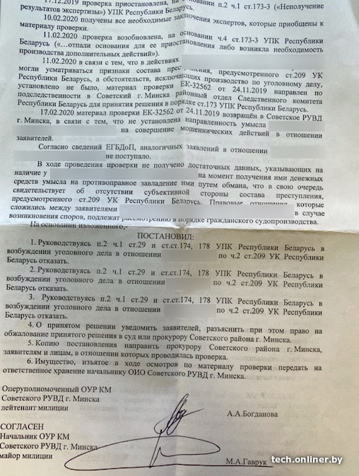 Спустя более двух месяцев, в начале двадцатых чисел февраля, Дмитрий получил постановление об отказе в возбуждении уголовного дела: на двух страницах идет подробное описание случаев других пострадавших, где в качестве продавцов поддельной техники фигурируют одни и те же три фамилии. Несмотря на это, «в ходе проведения проверки не получено достаточных данных, указывающих на наличие у [фамилии лиц, в отношении которых шла проверка] на момент получения ими денежных средств умысла на противоправное завладение ими путем обмана, что в свою очередь свидетельствует об отсутствии субъективной стороны состава преступления, предусмотренного ст. 209 УК Республики Беларусь». В общем, в возбуждении уголовного дела отказано.