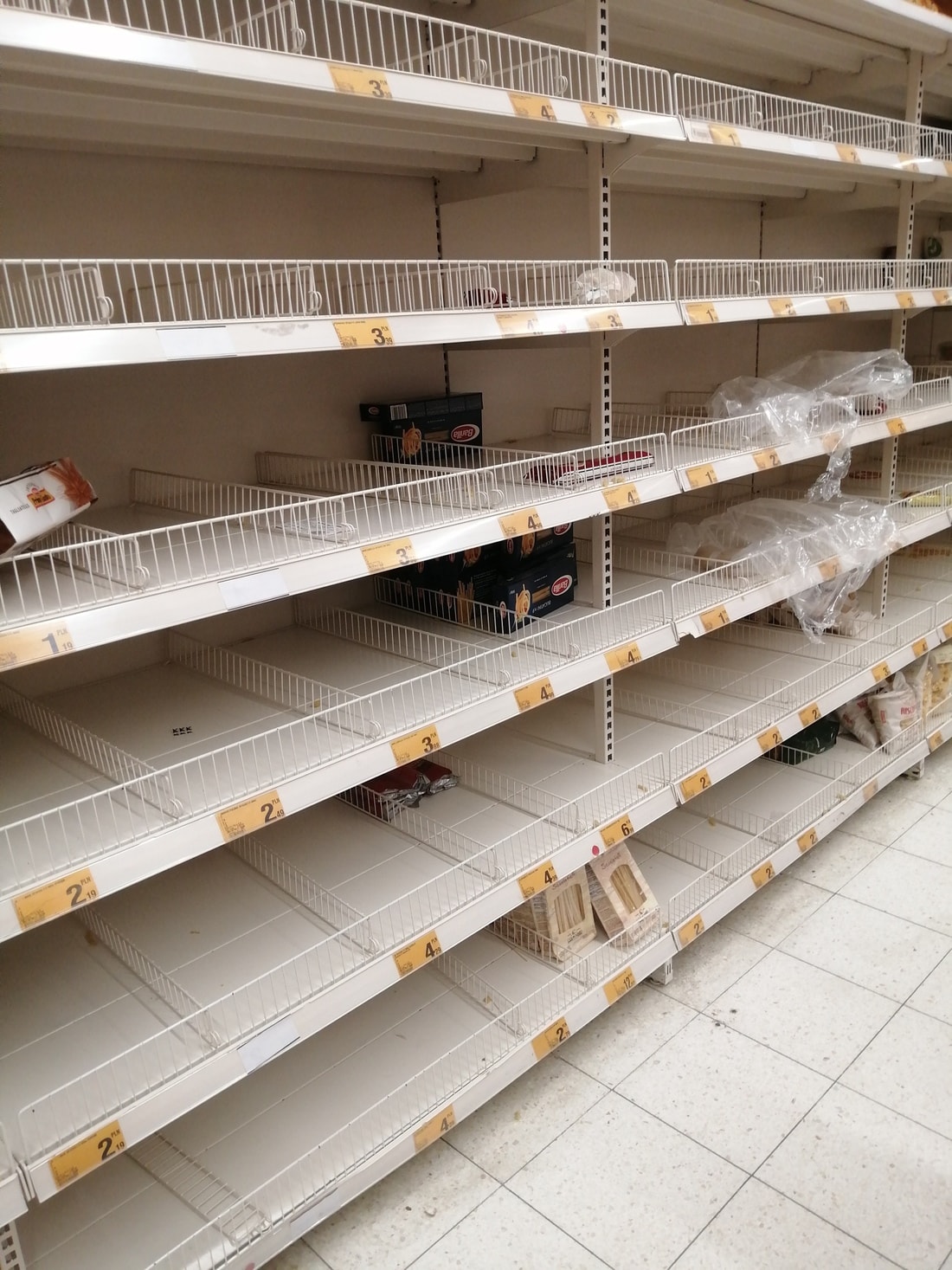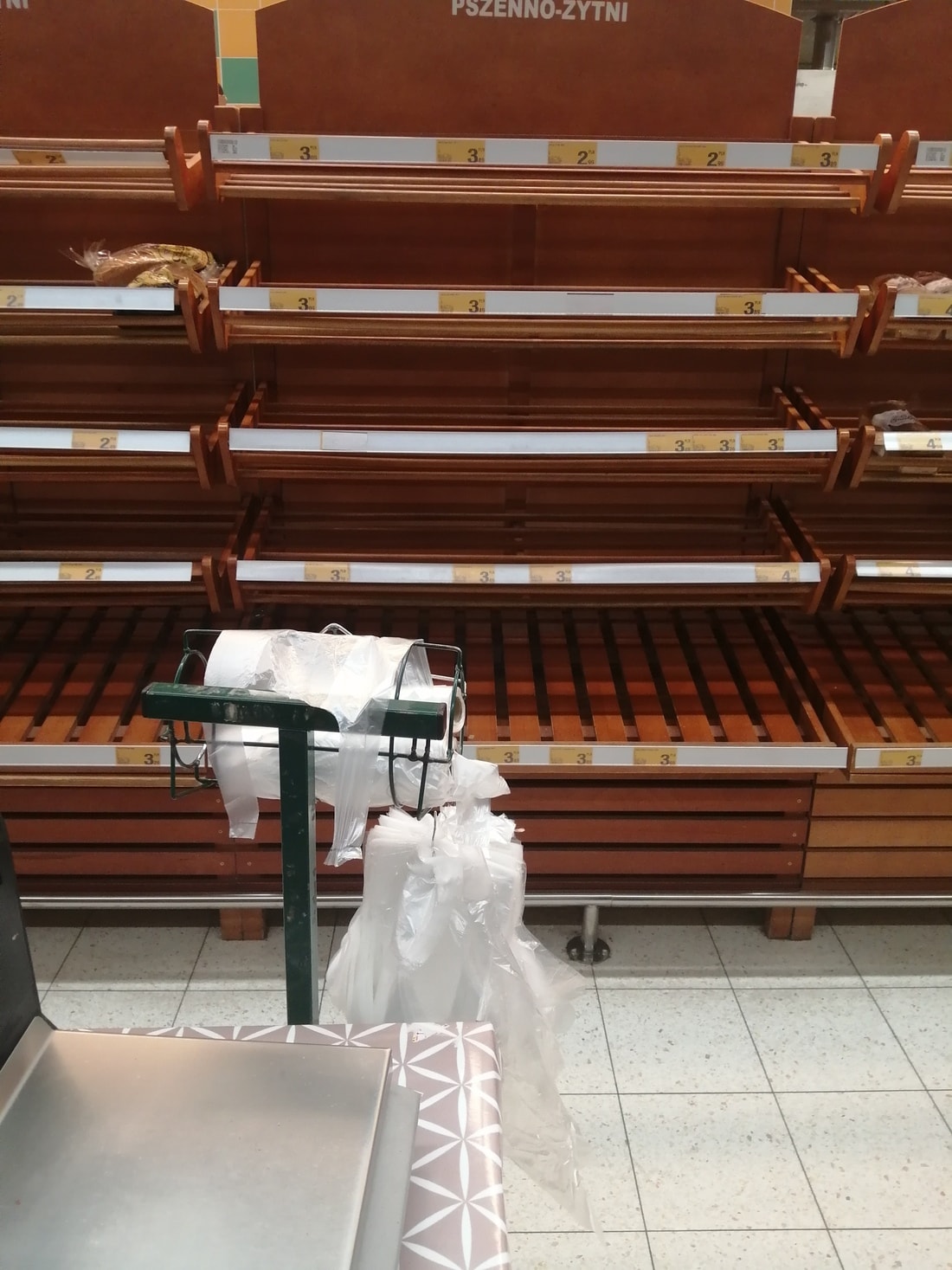 «Как таковой паники не ощущалось, но было жутковато на это смотреть. Людей много, пустые полки с водой, с хлебом, мясом, мукой, крупами, макаронами, тушенкой и туалетной бумагой. В громкоговоритель повторялась информация, чтобы „шаноýне панство“ надевали перчатки, прежде чем взять хлеб и сладкую выпечку».