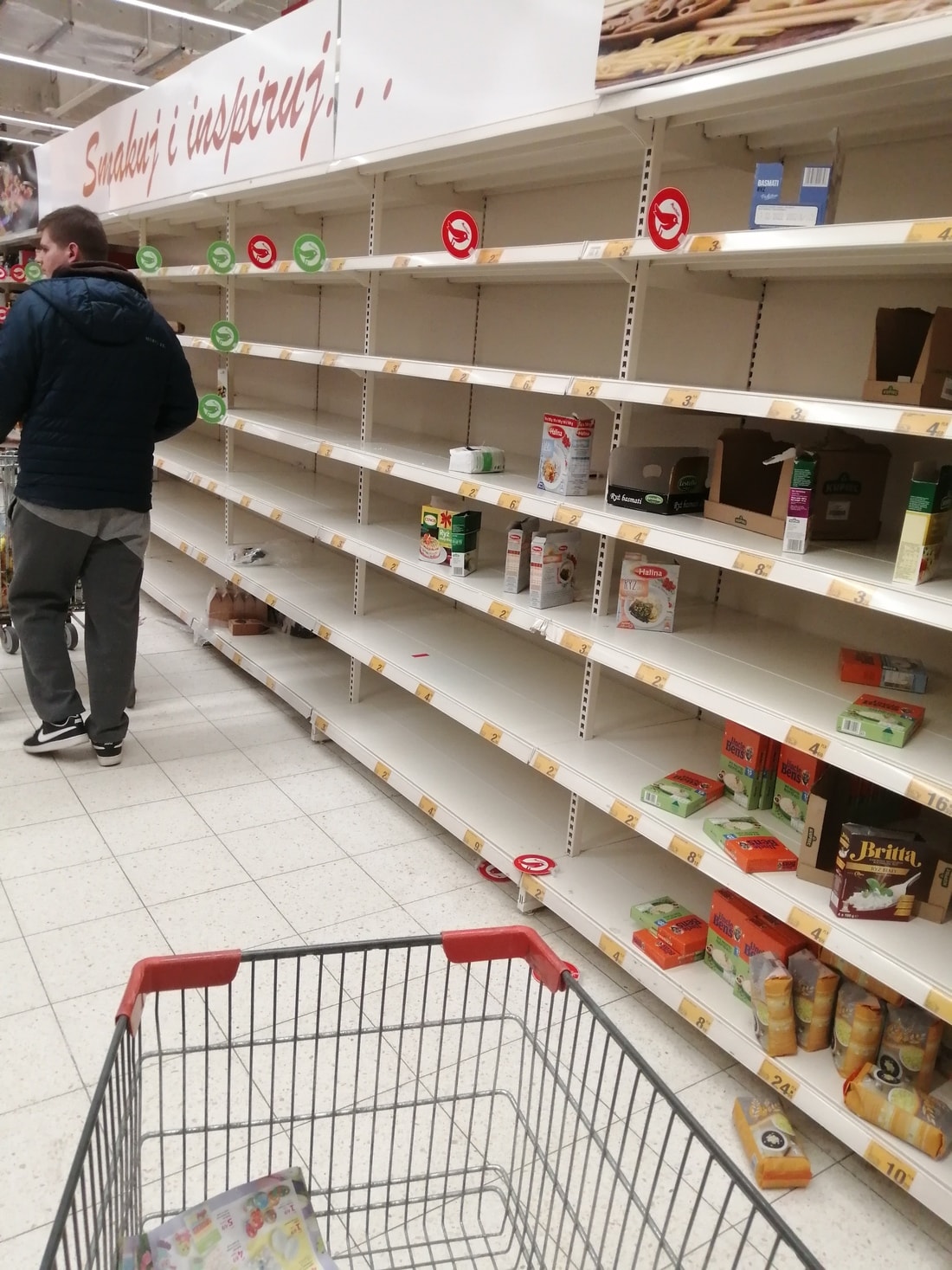 «Вчера в Белостоке после закрытия учебных заведений люди в магазинах набивали тележки», — рассказал он. Кто-то в одиночку умудрялся наполнить и две.