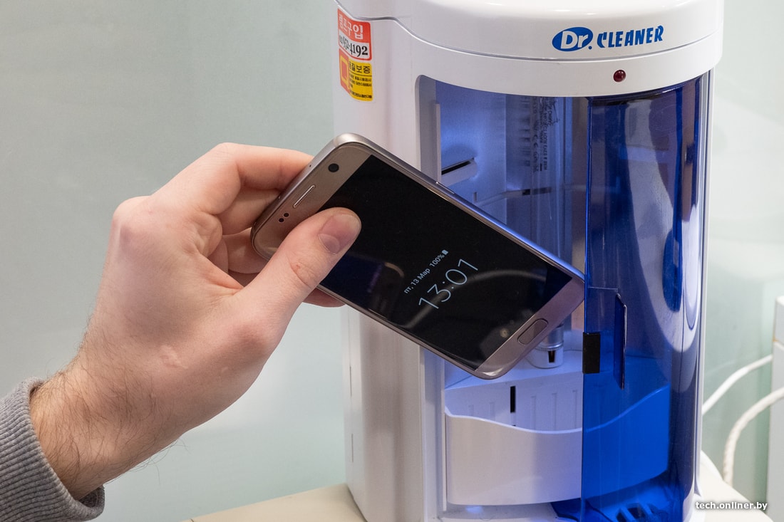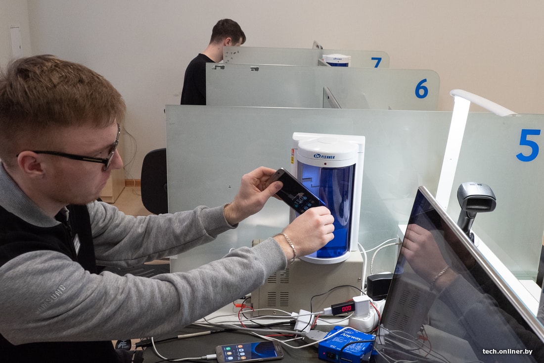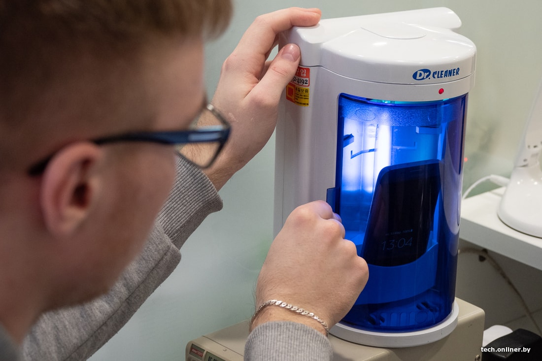 По словам представителя центра Samsung Service Plaza в Минске, он заключается в том, что устройства для дезинфекции установлены здесь с самого начала его работы. Они применяются перед тем, как отремонтированные гаджеты отдают клиенту (и перед тем, как отдать их в работу). Это базовая мера гигиены. В «дезинфекторе» устройства находятся около десяти минут, после чего на них не остается ничего вредного.