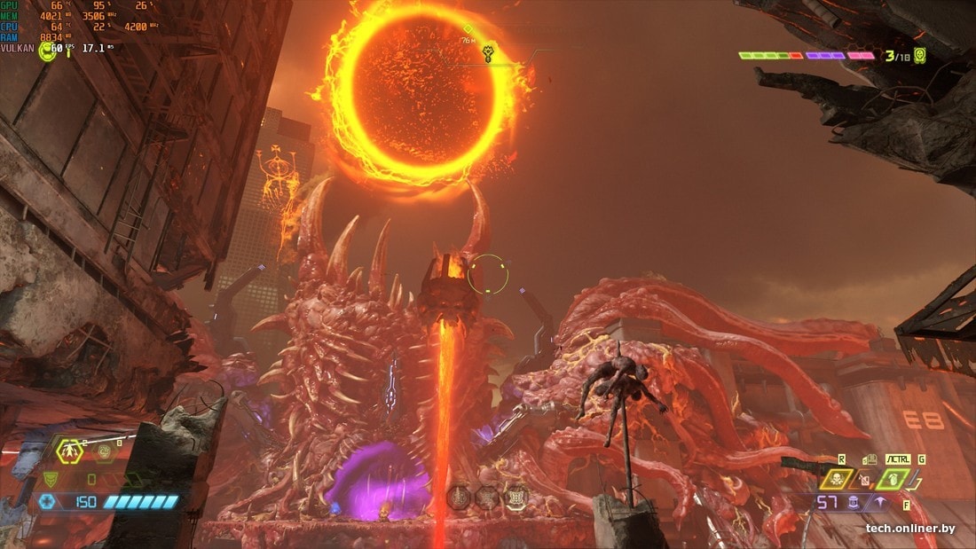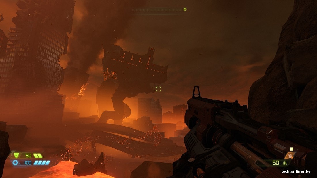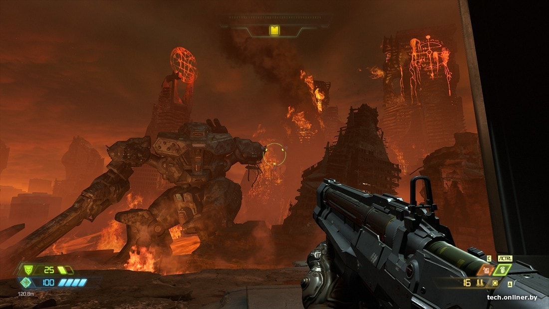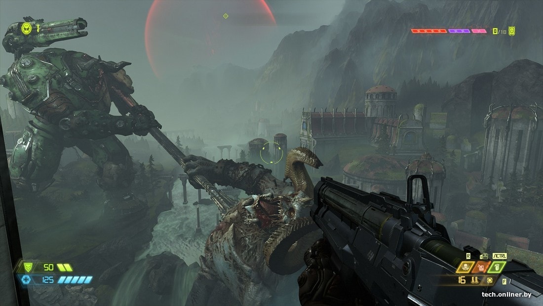 Стволами не ограничиваемся: врагов можно поджигать из огнемета, замораживать криогранатой, крошить бензопилой и добивать руками. Каждый из этих способов уничтожения демонов важно и жизненно необходимо использовать во время замеса, так как таким образом мы пополняем очки здоровья, брони или усыхающий боезапас. Подожгли толпу врагов? Из них будут сыпаться зеленые пластины брони. Скормили оглушенному какодемону его единственный глаз? Получите с десяток синих очков здоровья. Распилили подвернувшегося под руку импа — собирайте патроны к своим пушкам.