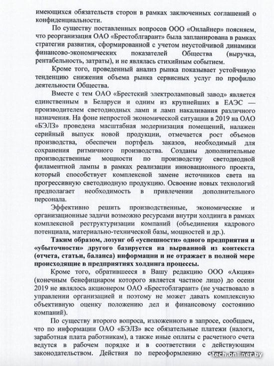 Одна из причин недовольства — в «Акции» называют «Брестоблгарант» вполне себе успешным и самодостаточным предприятием, а вот о «БЭЛЗ» отзываются менее позитивно. И, мол, этим присоединением «Горизонт» хотел помочь электроламповому заводу.